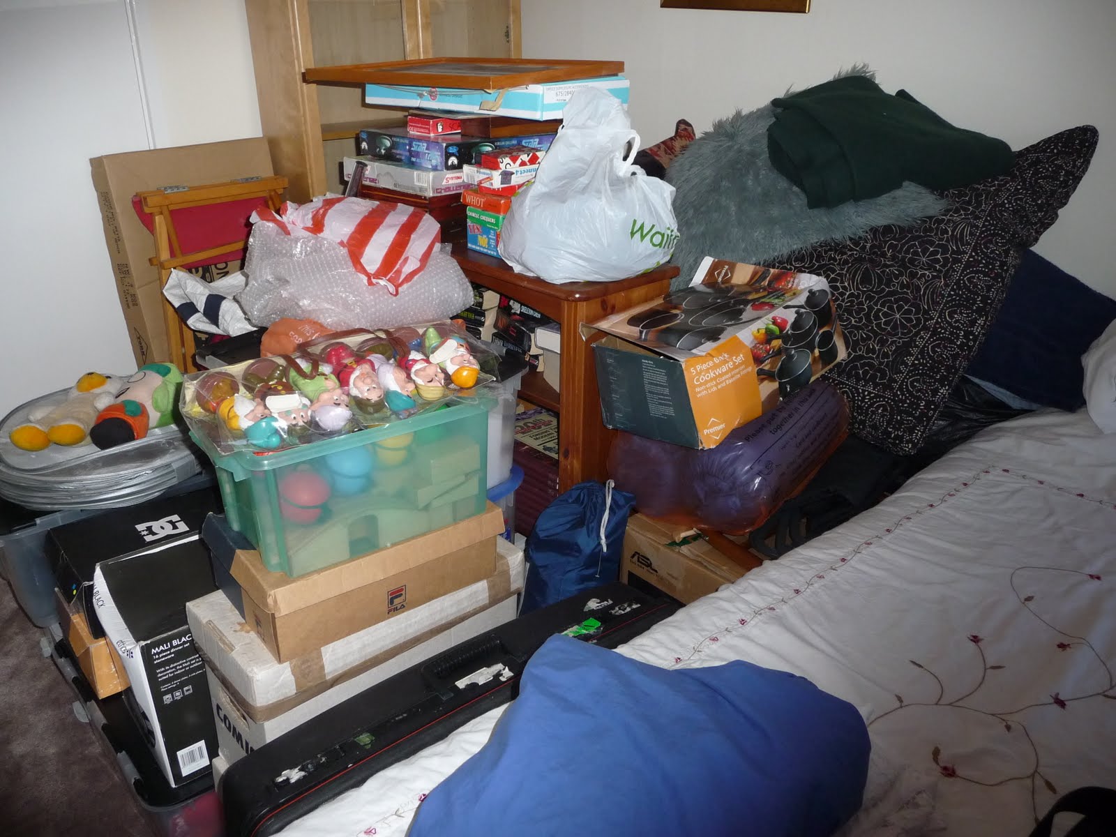 And when the shipment eventually arrives on our doorstep – all 44 cartons of china, glass, ornaments, rugs, wind surfing gear, clarinet & recorders, bathroom storage, makeup, jewellery box, sewing basket, footwear, clothes, handbags and holdalls, pictures, towels, christmas decorations and stationary, books and the printer (this could be one item we needed but have managed without thanks to others’ kindness), Kevin’s trouser stand and my sewing machine – just where are we going to put it all?