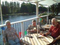Monday morning and I’m stiff and sore from a weekend’s boating. Friday and Saturday I was on the south coast pottering about getting Temptress ready to go to sea for a couple of weeks next weekend; provisioning, polishing and trying to tick off a few jobs on the eternal to-do list that every boat has. Sunday morning I joined other Minima Yacht Club members on the balcony (piccie left is the same location on another sunny day back in July 2002) to watch umpteen hundreds of crazy people complete a swim from Hampton Court to Minima YC’s landing stage opposite the clubhouse in Kingston. That’s around 2.25 miles in the river Thames. I know the river is much cleaner nowadays but its not somewhere I would voluntarily swim! Will upload some pictures later when I can retrieve them from my camera.