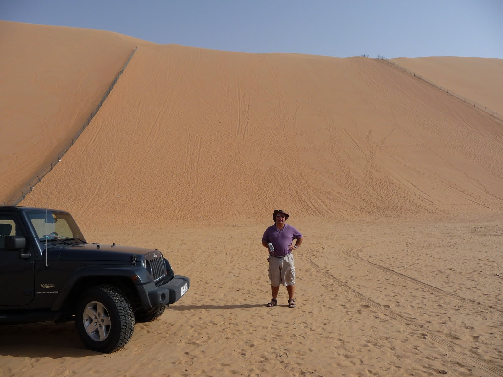 At the end of the road was Moreeb (or Mureb*) Hill at 210 metres top to bottom is probably the tallest dune in the UAE, its peak is around 300 metres measured from sea level. The long steep side rising up at an angle of around 50 degrees makes it an ideal location for a uniquely Arab sport – drag hill climbing. At the base are the makings of a large show ground purely there to support national and international events that are regularly held here. On a Saturday morning in April the only other person present was a gardener patiently driving a tractor mower around a huge expanse of grass. We drove through an open gate to the very foot of the dune and looked up in awe. Too lazy again to deflate the tyres and so make a climb attempt ourselves (we should invest in a new compressor that will inflate them faster than 20 mins per wheel) Jeanie Jeep and the skipper posed for a photo, another cache bagged.