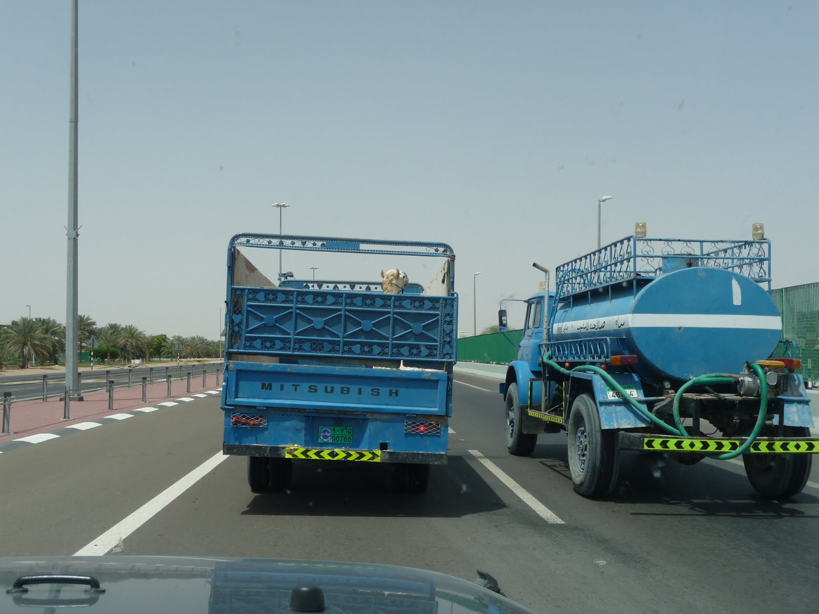 The one problem with new roads here is that someone eventually wants to widen them. By the time we reached the towns 100k or so south of Al Ain our route had become a major highway with little traffic except ourselves. We were temporarily held up in one village by two lorry drivers who occupied both lanes whilst they shouted friendly greetings at each other which then developed into a lengthy conversation as we all traversed the vicious sleeping policemen laid to slow down traffic through an area built up on both sides of the road. The pale camel coloured camel in the back of the truck regarded us inquisitively, we and the water bowser to his left were probably the only other vehicles he’d seen since being loaded onto the truck. On our route north the “camel fences” designed to keep the eponymous animal from being harmed by speeding vehicles were, on our right hand side almost one with the UAE/Oman border fence. Just a sliver of culivated land tracked between the road and the border on the UAE side all the way to Al Ain.