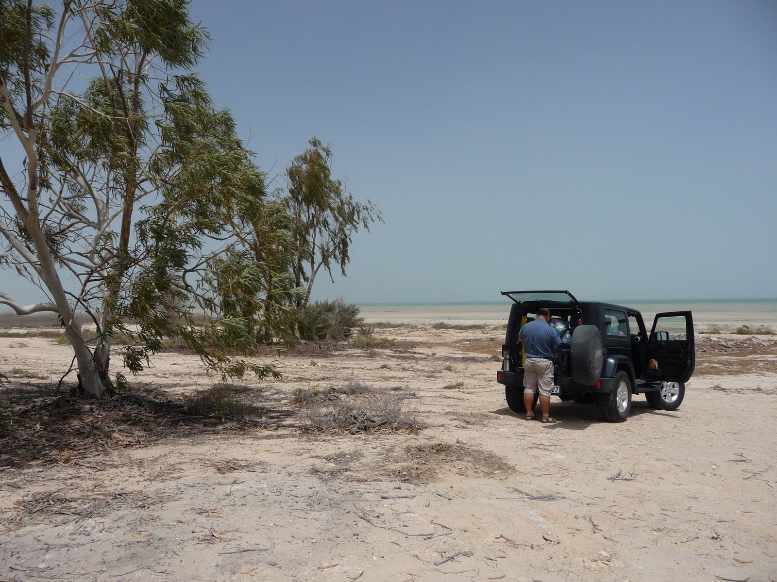 Before it gets too hot we wanted to take Jeanie Jeep on a desert camping expedition. Friday dawned windy but undetered we drove down the E11 towards Abu Dhabi (AD) and beyond with Jeanie’s sand-wake streaming out behind us. Somewhere near Tarif to the west of AD we realised we could indulge in a spot of Geocaching to liven up our morning’s meandering (for those uninitiated in this slightly crazy nerdie/techie sport click here). We headed off the highway for Al Mirfa a little fishing port west of AD. Having failed dismally through the illegibility of the clue we cheered up with the realisation that there were more caches not far away to seek out. Previously with the help of a friend we had uploaded the coordinates of most of caches in the UAE to our GPS so instrument in hand we headed off for the Salt Mine further west along the coast.