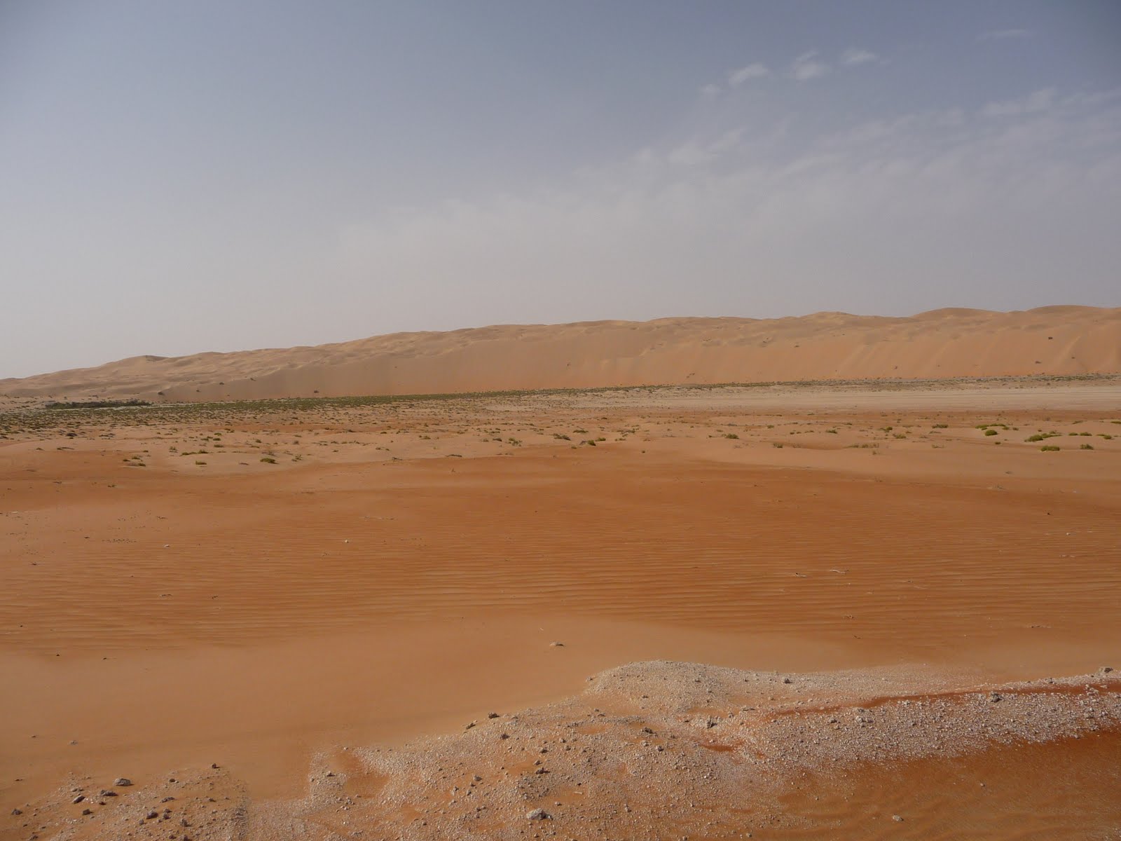 Retracing our steps we finally entered the western end of the Oasis, a series of valleys in the sand that have sufficient water to turn them into green marvels growing much of the local vegetables we buy. Each valley has its own little community with the central Oasis town of Meziera’a having shops and important offices like the municipality and the police etc. A few miles or rather kilometers as that is the measurement used here, just short of Meziera’a, in Qatuf we turned south again onto the Moreeb road. Over the sand hills, down past the industrial area and up into the desert. The scenery is spectacular, undisturbed reddish sand – the boy racers from AD and Dubai with their 4x4s ands quad bikes don’t often make it here – and silvery grey deep valleys where the sabkha (Arabic for salt flat) is revealed. The latter is where the water table lies close to the surface and the moisture is drawn up by capillary action only to evaporate in the scorching heat leaving deposits of salts and gypsum (is gypsum a salt…), hence the colour. Drive on it at your own risk as the surface is easily broken and a vehicle can quickly find itself deep in the underlying quagmire and the end will be grisely.
