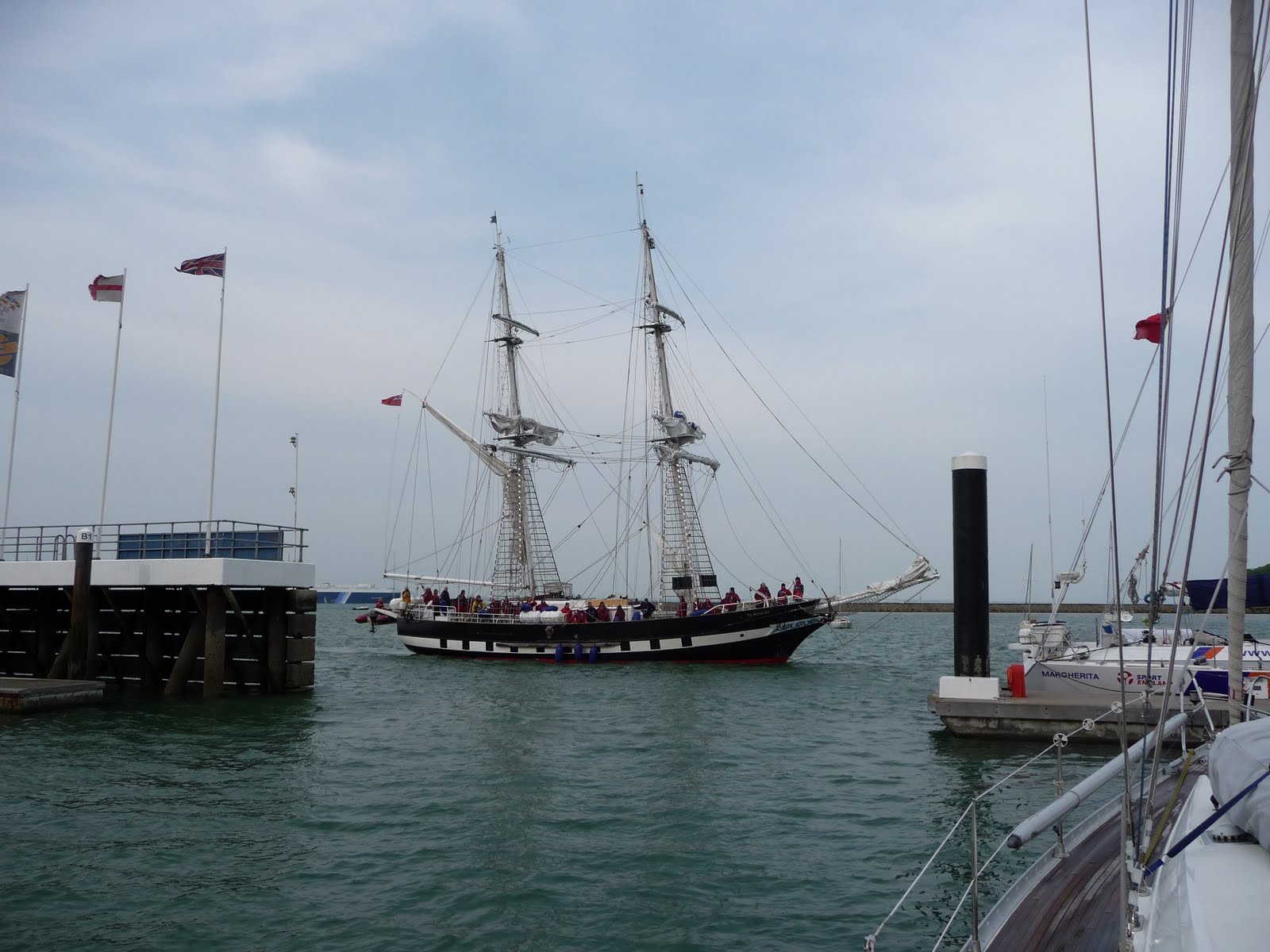 Off Southsea beach we indulged in a bit more sail handling this time it was judged the only safe place to take the genoa down in the strong easterlies as it would be on the beam in our berth. George the autopilot was left in charge of sailing whilst I handled the halyard and Kevin went forward to wrestle the acres of cloth. It all got a bit wet when a gust blew the bow off head to wind and part of the sail made a bid for freedom but between the pair of us we recovered it aboard and tied it down. A quick fill up with diesel on the way into the marina and we were back in our home berth in time for lunch. Eos and Aspen were still there, the weather delaying to their plans to sail across the Channel south to Brittany’s warmer climes for a couple of months or so. (Premier Marina’s offer their berth holders a sabbatical repaid through a reduction in the following years mooring fees which means you effectively save some money by taking a break from your home port for a month or more up to three months I think.)
