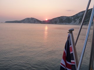 The northerly wind was ideal for reaching across Christchurch Bay past St Albans Head and into Weymouth but bitterly bitterly cold for us Middle Eastern dwellers with our now thinned blood. Without consultation both crew donned full winter thermals, mid-layer salopettes lined with fleece, fleece jackets, hats, boots and oilies. The first mate found a scarf and gloves too and used every excuse to escape down below to the warmth of the galley to try out the new toy Mr D’s Thermal Cooker or to the nav table. Listening to the VHF we realised that being a midweek in April Lulworth range was active to headed south of the whole area partly to avoid it and partly because it was a faster course to sail.