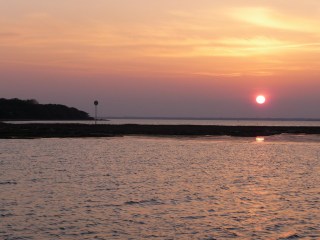 Wallop. Somewhere just short of the Hayling Island side a few boat lengths from the ferry pontoon the keel hit the putty at seven knots. Ouch my knee hurt from falling forward onto it on the side deck where I’d been bending down to pick up a mooring line. More than ouch I realised my thumb was leaking profusely all down one side having apparently had the wire that opens the jaws on the spinnaker pole embedded in one side of it briefly. Now I know why they call it a cheese-wire! Two neat slices above and below my thumb knuckle. Fortunately with the wind and tide opposing each other Temptress was happy just to sit across the north end of the harbour entrance whilst first aid was administered. Harbour dues extortedand a bright red sticker newly attached to the port quarter, Temptress headed down the Solent to Newton Creek to spend the night on a bouy. There is nothing so wonderful as taking the tide out of the Solent through the Needles Channel – it always brings back memories of holidays and races past whilst anticpating adventures to come. We were amazed to see looking north across the Shingles a new bit of England – dead on high water and there for all to see were a hundred yards or so of shingle standing several feet above sea level. Probably a sight you’d only see once in a lifetime.
