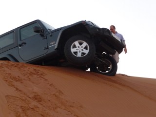 Desert drives are not done alone, it’s good practise to have at least one other vehicle with you if you are heading into the dunes. When (and not if) one gets stuck or breaks down then the other can recover you. During a recent trip not one but two cars popped tyres off during the course of the morning but thanks to plenty of experience a team effort ensured these were soon fixed without even resorting to changing the wheel in either case. With the car jacked up to raise the offending wheel off the ground (some digging was also required) the tyre was rinsed in water to remove as much sand from the inside as possible, then reinflated until it was firmly in place on the rim before deflating back to the lower pressure used in the sand.