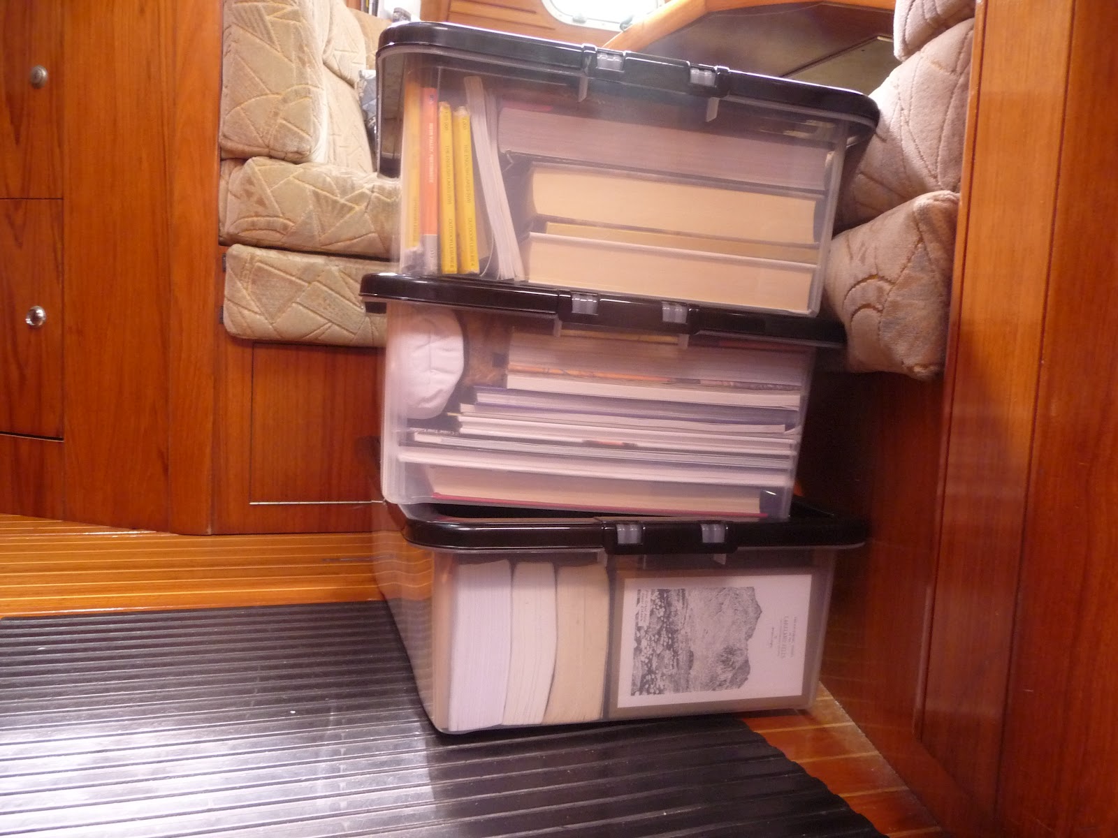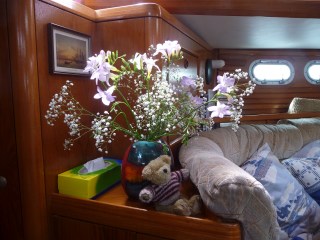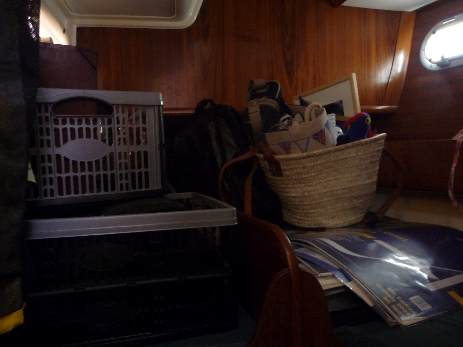 With storage ashore kindly provided by our home marina slowly we are emptying cupboards and shelves as well as the port aft cabin, which in live-aboard mode is used for stowage but will be required for crew accommodation from Thursday. It is proving to be a great opportunity to clean places seldom reached! Meanwhile the boat is a mess with piles of things everywhere until it goes ashore. However during this unexpected spring clean we have even gone through those boxes of spares that every boat carries – plumbing bits, light bulbs and deck gear – throwing away rusting objects whose original purpose is a mystery to both skipper and first mate and reinstating some order to each box in case the contents are needed in a hurry.