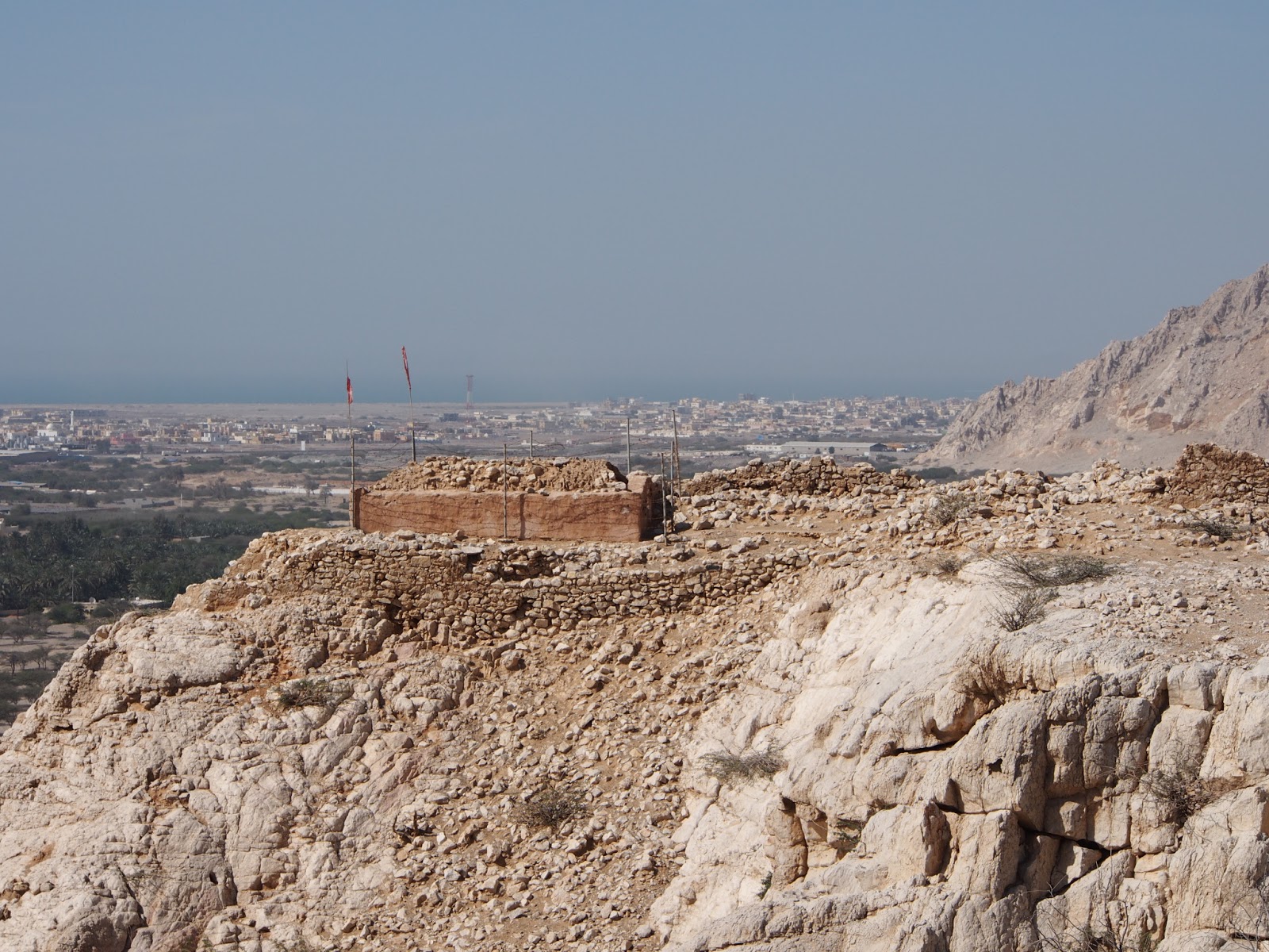Our next stop was to hunt for the Sheba’s Palace cache. At the back of the village of Shimal, a steep set of modern steps petered out into a gravelly goat track up to a curved rocky promontory. We were glad to have come here in the winter as it was hot work climbing up in the full sun. There were goat remains is several places, it was obviously a popular haunt for the local herd. As we rounded the corner we could see the ruined walls and what looked like someone’s tomb on one arm of the rock. The latter had a barbed wire fence and the remains of Emirati flags flying at each corner. From the other arm there were great views out over the flat land to the city and the sea beyond despite the somewhat dusty haze.