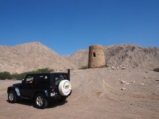 Last weekend found us in the emirate of Ras Al Khaimah looking for a geocache that had escaped us on a previous visit. Close to our goal we stopped to tick off a few other caches, the first of which was located near a lookout tower. These rather Portuguese looking towers are common in the Northern Emirates where pirates and marauders were once frequent unwelcome visitors. They are usually round, constructed of coral stone and date palm logs covered with a reddish plaster finish. This one was not particularly tall but being built on a slight mound was probably sufficiently high in this flat landscape below the mountains to enable a good view out to the Arabian Gulf. Today even from ground level you can see the buildings of RAK City just a few miles away on the coast.