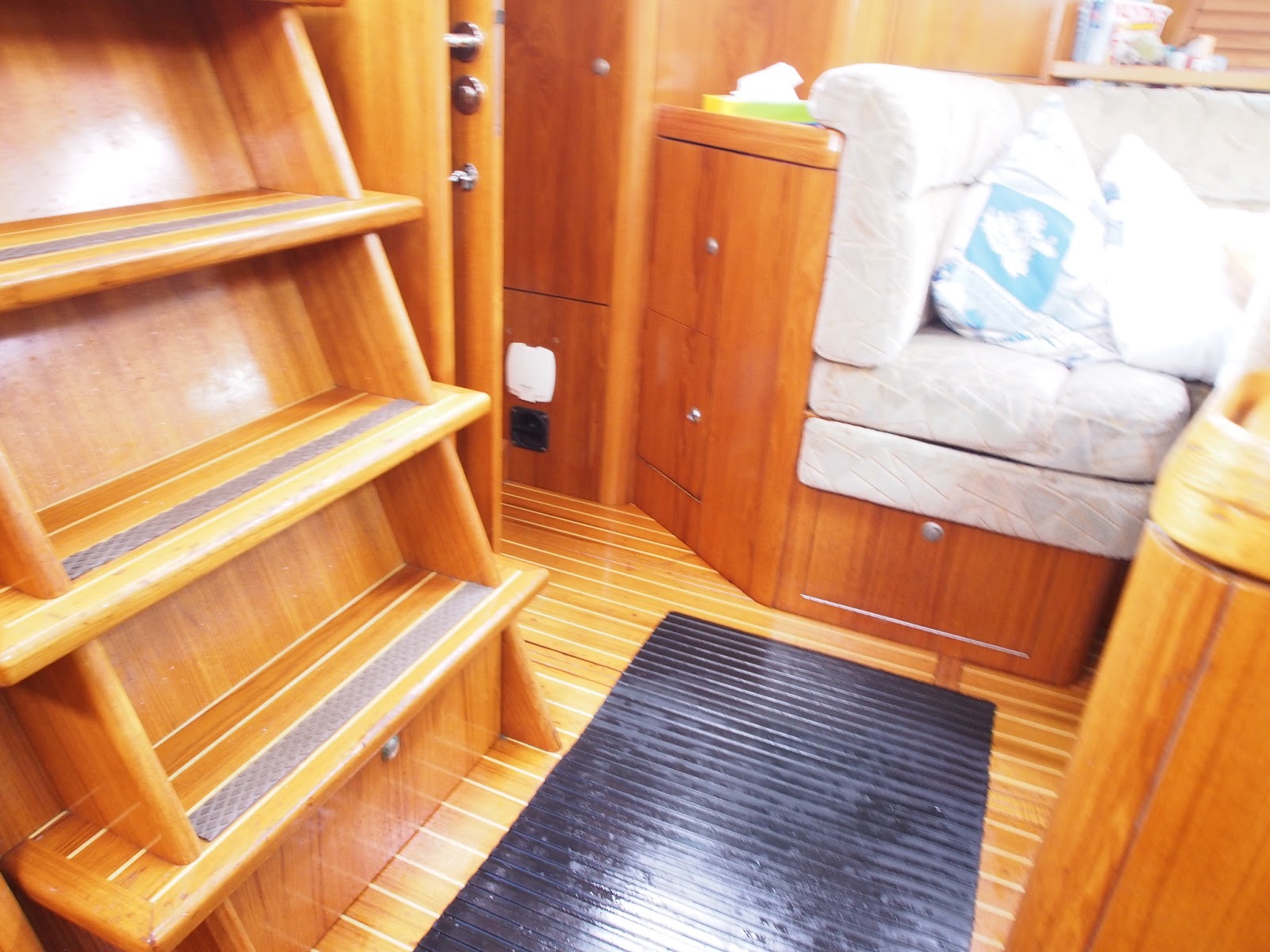 At some point, whilst the First Mate was down below on hands and knees by the companionway steps retrieving a tin plate from a locker to use serving our porkpie lunch, there was a huge roar followed by a lot of seawater tumbling down on top of her. Shaken and soaked she scrambled up the steps to see the Skipper still gripping the helm grinning hugely, he’d been up to his knees in water as the cockpit was filled by a rogue wave that broke into the boat from behind. Temptress had been pooped for only the second time in our ownership, in much the same conditions as the first time back in 2001 off the Portuguese coast. The aft heads was drowned as water flooded in through the open porthole set low in the forward edge of the cockpit. We congratulated ourselves on having the foresight to move the drying laundry to the forward heads be setting off. The water poured away through the large drainholes at rear of the cockpit almost as quickly as it had entered. The shower pump dealt with the water in the heads and the saloon floor could be mopped with fresh water when we were in port, it needed a wash anyway!