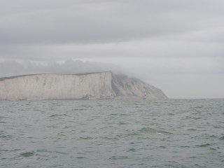 It was a great sail, a tiny scrap of jib, grey mounting seas. Only really rough off Bexhill where a shallow bank extends its influence south westwards for several miles off the coast and again at Dungeness Point. There was little rain despite the forecast, mostly we got wet from spray as waves slapped up on our starboard quarter and the wind whipped their tops across the cockpit. The coast came and went through a veil of misty drizzle but we identified Bexhill, Hastings, the squat buildings and the lighthouses of Dungeness, spotted the fishing boats pulled up on the stoney beach just beyond the power station and later Folkstone and the White Cliffs of Dover hove into view.