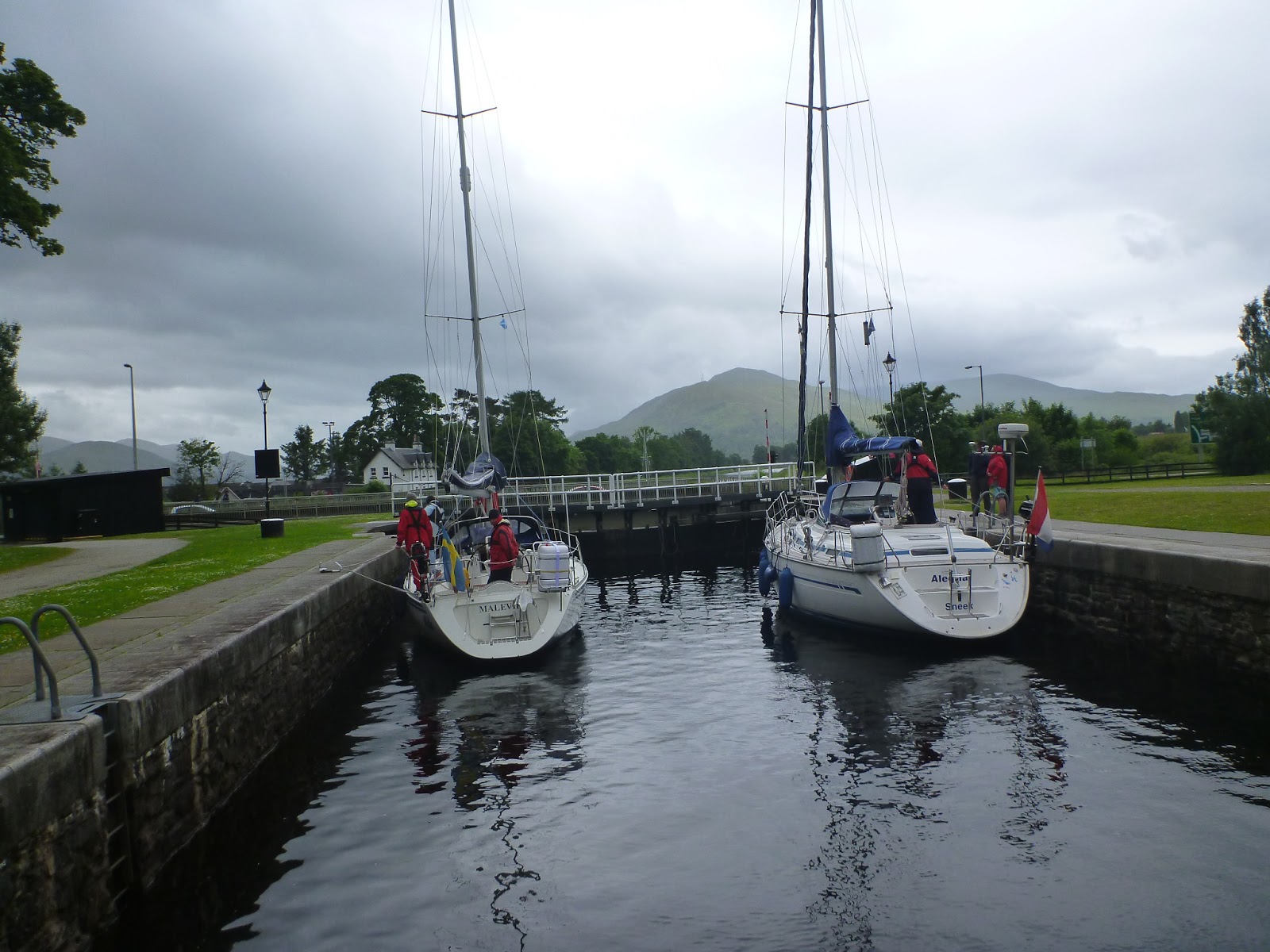 This last stretch of the Caledonian is the most strenuous, first the Neptune Staircase – 8 big locks down in succession, the bottom gate of one forming the top gate of the next, hence stairs. No warm up to this exercise just straight off your mooring and straight into it, throwing lines, catching lines, hauling lines, snubbing then easing lines. It was raining further down the valley, the low level cloud would reach us before we completed the flight so oilies were made ready. The journey down started soon after 11am and took almost two hours. We, in common with the rest of the boats, had failed to actually count the number of gates or chambers marked on the chart and, as you can’t see the bottom from the top, it was something of a surprise after lock six to realise there were still two more to go! By the end arms and shoulders ache, fingers were wet and sore from the lines whilst we were very damp from the drizzling rain, grateful for our scruffy yellow jackets and trousers. The final road and rail swing bridges opened and Temptress could glimpse the sea once more off to the left through the trees lining the last stretch of canal…. There was still another flight of two locks as well as the sealock to negotiate.