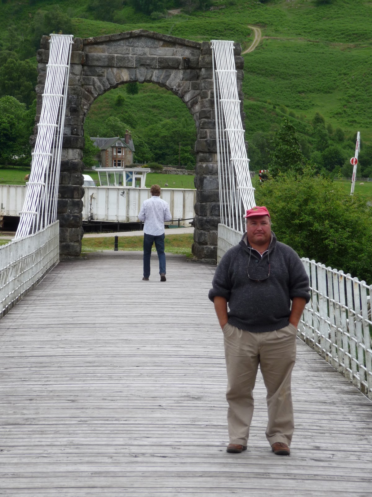 We were beguiled by Loch Ness and dropped the hook in a quiet bay near Castle Urquhart for lunch. Most days we managed ten or so miles, one day only four! Fort Augustus proved to be very touristy with Nessy, trip boats, rib rides and gift shops but we met a lovely lady working as a glassblower and enjoyed watching the tourists taking pictures of us moored alongside the canal below the road bridge. At Loch Oich we took a walk on the “historic Bridge of Oich” and were a little alarmed by signs that warned the maximum number of pedestrians on this ancient suspension bridge over the river was fifty, fortunately there was only one other person around that evening. The bridge itself goes nowhere nowadays; there is a gate on the far bank with no access for the public to the garden and fields beyond.