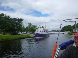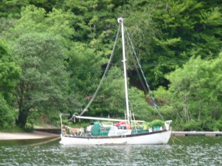 We met quite a lot of Old Gaffers transiting in the opposite direction to ourselves at intervals in the lochs and canalised sections (our headwind was conveniently easy downwind sailing for them). This year being the 50th anniversary of the Old Gaffers Association they were celebrating by sailing around Great Britain. It added interest to our days as we photographed and in some cases even got to meet the crew of these lovely old boats. Peggy for example was an extremely low freeboard, wide bellied wooden boat with a royal blue hull,a relatively tiny gaffer for this length of voyage. We met her one evening above Laggan Lock, her owner more than happy to retell her history. She had been a Morecombe Bay Prawner (hence her deck being only inches above the water to make it easier to haul in nets) prior to being converted into a cruising boat. Mostly Peggy nowadays confined her sailing to the rivers of Suffolk but her owners thought the challenge of the OGA anniversary Round Britain cruise too good an opportunity to miss so here she was and though “she took a bit of water over the side” when they met a gale in the Bristol Channel on the passage to Milford Haven they were mostly enjoying sailing to new places.