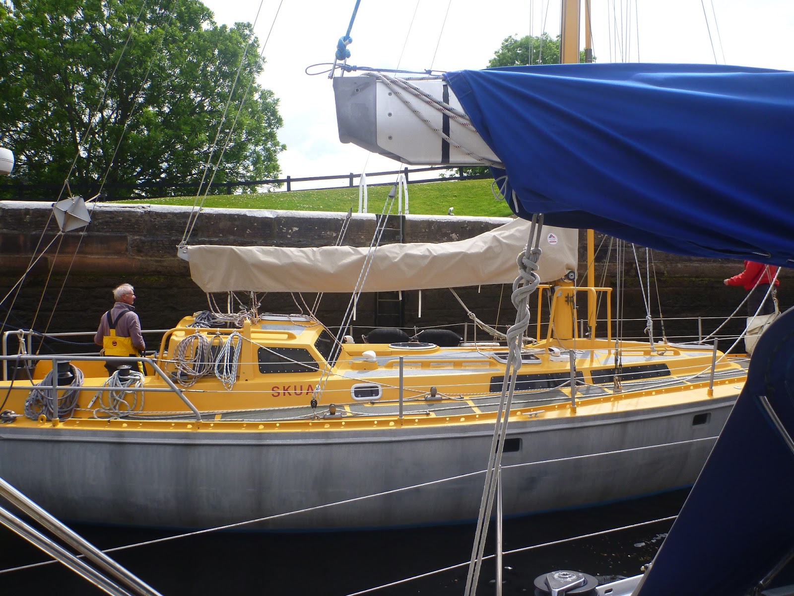 Usually four or so boats at a time fitted into a lock, sometimes a mix of cruisers and yachts, sometimes all yachts. Temptress shared one lock with the Jacobite Highlander, a large and very purple, passenger carrying boat that does tours from the Inverness area along the canal to Loch Ness. Most of the single locks were run by one keeper who ensured the front boat on one side were secure before briskly moving round to the other bank across the gate and helping the two boats there get sorted then returning to secure the final boat and close the gates.