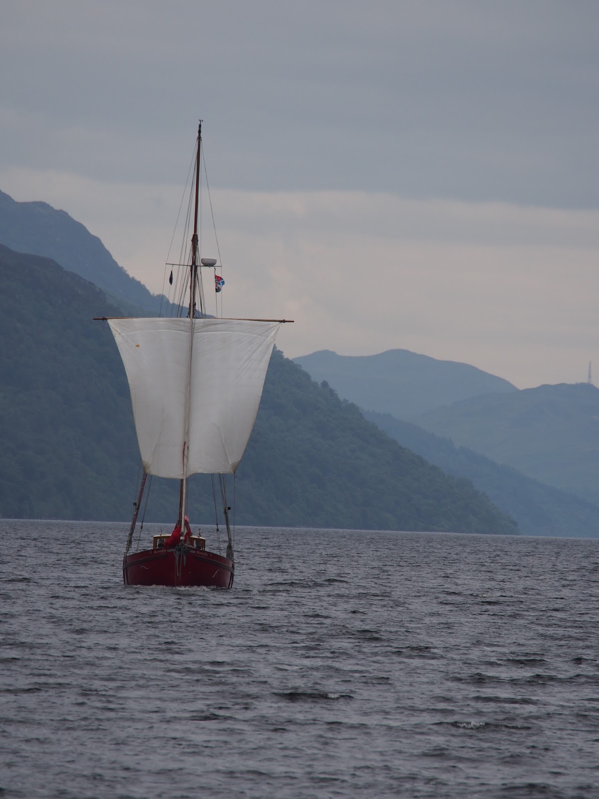 No sign of Nessie except a very purple plastic model on the shores of the eponymous loch but there was (probably) a Peregrine Falcon preening itself at the top of a dead tree by Loch Lochy (no idea what else would be that big and that colour just there), many swallows darting here and there and some anxious swifts (we’d moored in front of their nest in the quayside wall whilst waiting for the locks back at Muirtown) plus a few chaffinches in the villages and everywhere oystercatchers with their distinctive call. Meanwhile our boat spotting tally almost had a Viking Longship added to it but the boat in question turned out to be a red hulled gaffer” Bonify” flying a square sail from a yard as they headed north east up Loch Ness towards us!