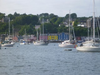 The Hebridean Princess arrived mid-afternoon, her black and white hull making her look for all the world like a Calmac ferry (apparently she once was one but nowadays is occasionally chartered by HM), she anchored down the bay from us with a loud rattling of chain that sounded like a massive thunderstorm below on Temptress and sent us scuttling on deck to see what calamity had happened in the harbour. This miniature cruise ship is now quietly swinging to her chain presumably her passengers will be going ashore shortly. As the afternoon wore on hordes of cruising yachts arrived, Tobermoray on a grey Friday evening seemingly a magnet to every visiting yacht for miles around including the fleet of the Round Mull Yacht Race arriving from Oban. Great for boat spotting and people watching with practical lessons on how to or how not to anchor thrown in for good measure!