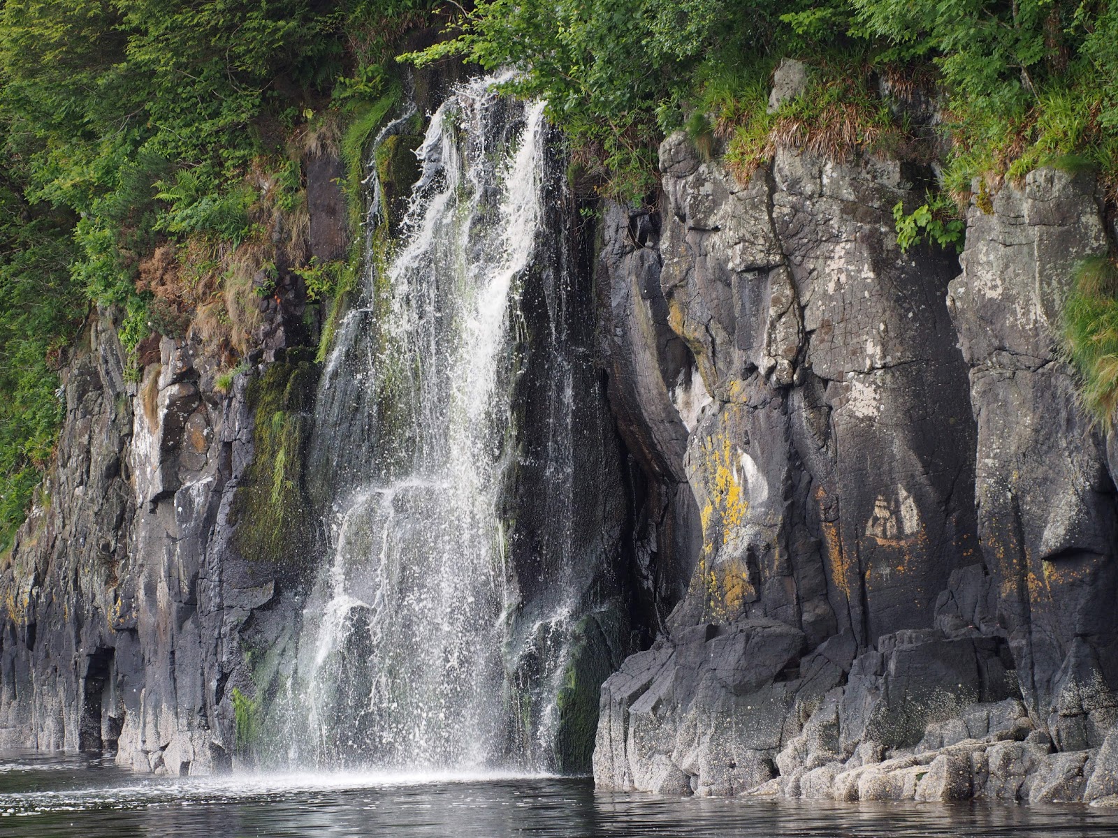 On their cliff perch they spend most of their time preening (possibly because their toilet habits mean that the lower birds are frequently plastered with a stream of guano from above). They roost with gentle satisfied squawks, coos and clucks rather like hens in a hen house. They are surprisingly vocal though when a bird lands close to a nesting pair becoming quite a rumpus. Some of the Shags have young, some are sitting tight on twiggy nests whilst other pairs are still fighting over lengths of seaweed with one placing it on the cliff ledge then their mate picking it up and swinging it about, some sort of mating ritual? No idea but it has been a fascinating few days, even more interesting than the waterfall in full spate a short distance further along the cliff which would have made this anchorage unique and enjoyable in itself. The water around Temptress is streaked with the peaty brown water of the stream which has hardly mixed with the clear green of the sea when it reaches us, clear stripes until the boat swings and acts as a giant spoon. The sea itself is so clear that the bottom many metres down can be seen as can large orange capped jellyfish that drift past from time to time.