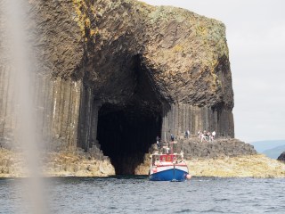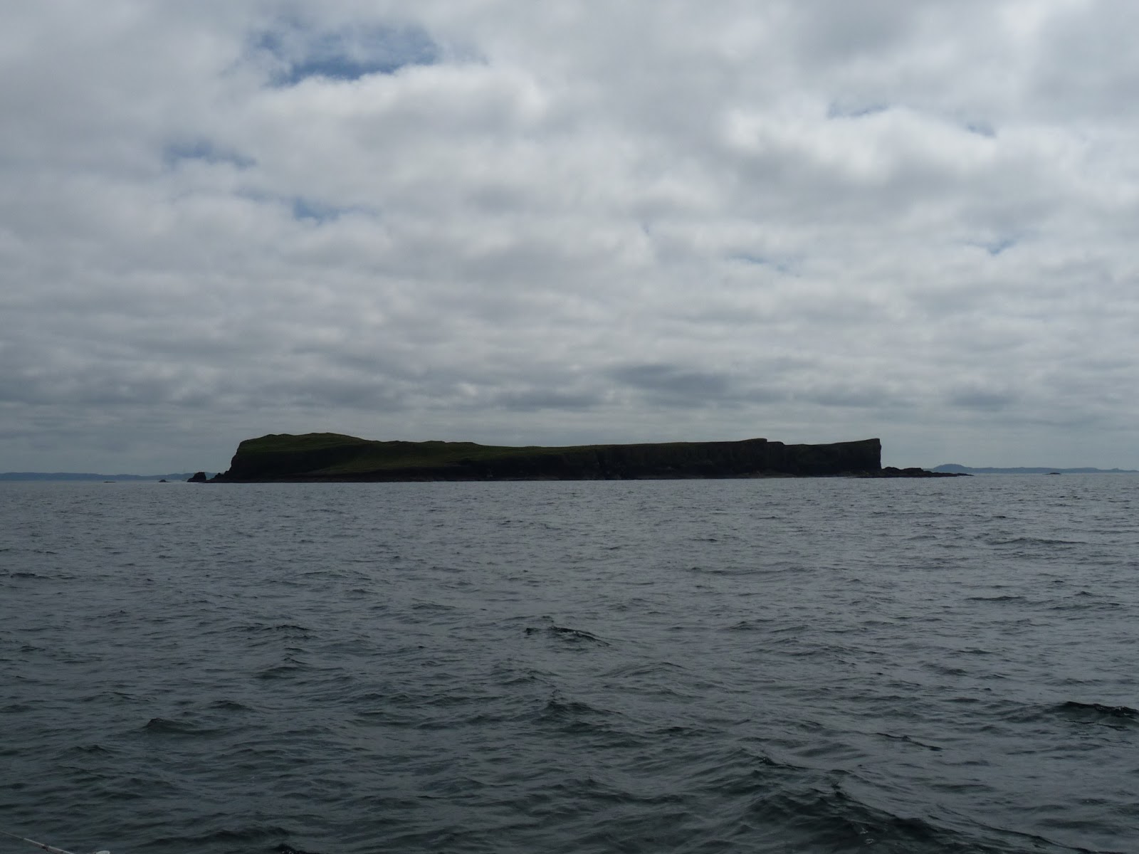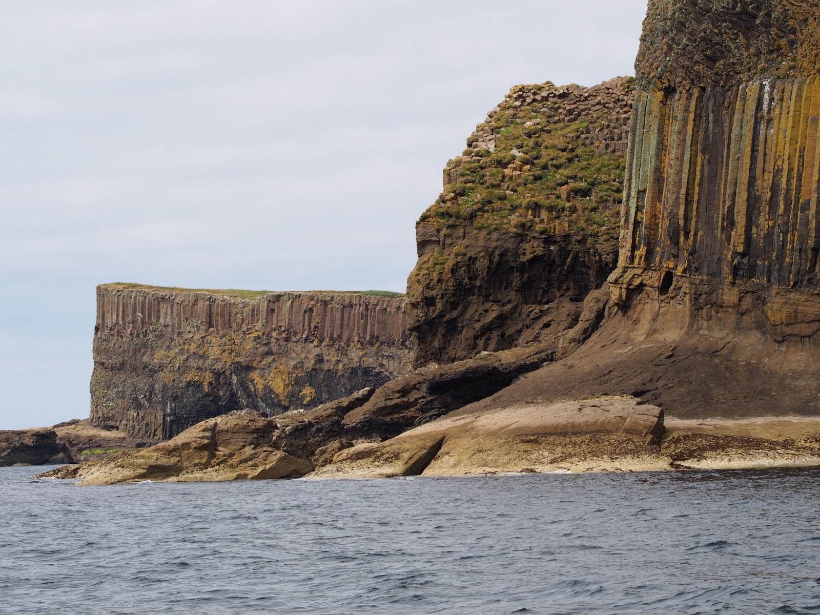 After a night in Tiree the weird outlines of the Treshnish Isles (mostly pancake flat with a conical bit in the middle of the appropriately named Dutchmans Cap) and the caves of Staffa beckoned. It was a lazy slow sail downwind with just the jib but a great speed for mackerel fishing, though we only managed to find one, now gutted and stowed in the fridge. Off Staffa we joined the tripper boats and some other yachts taking advantage of one of those rare days of the year when boats can get close to the island. There was little swell so one tourist boat safely offloaded its customers at the jetty to walk round the rocks into Fingals Cave inspiration of music of the same name. One yacht had launched a rib so all their crew bar one could go ashore and were standing on the islands peak. We ventured in as close as we dared for photos of the basalt columns whilst a motor boat took its passengers right into the mouth of the cave. An amazing experience and another unique opportunity for photographs and a memory that we’ll recall warmly in years to come.