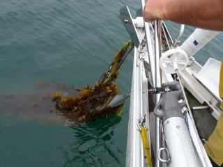 Over the years though we’ve observed that often crews are completely flummoxed by the additional object on the anchor but it usually is calmly sorted it out with a bit of ingenuity by the skipper. In Bunessan on the Isle of Mull and later after a lunchtime stop in the picturesque but tiny Easdale Sound weighing anchor resulted in bringing up a complete camouflage canopy of kelp which took some contortions with the boat hook to lift clear bit by bit. Our once shiny new Delta is finally starting to look used.