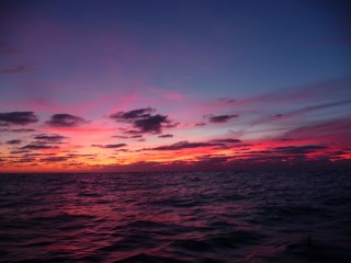 Watches started at 21:00 with a two on, four off pattern. Dolphins continued to join us from time to time all night, trails of phosphorescence marking their swoops and dives through the water. The wind which had topped about F4 in the later afternoon was gradually moving round to the North East and decreasing through the evening so that by half eleven the engine was on again with 439 nm to go to the waypoint and just over 100 nm run. With scarcely any cloud and no moon until almost dawn the stars were amazing. Unless you have been at sea or deep in the desert you rarely get a chance to see the Milky Way like this even readily identifiable constellations seem to be painted on a backdrop of stars.