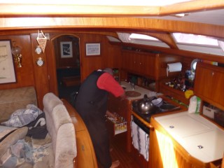 A note of explanation about the Bay Restaurant – you can locate it in one of two ways; either sail down190 degrees from Cork Harbour or alternatively follow the trail of veggie peelings from the same location. It is open for breakfast, lunch and supper serving good hearty crew meals. The three chefs are all well practised in the gentle art of juggling pots and pans on a swaying cooker as the boat bounces off the wave tops and can behave like an octopus when it comes to serving up into several bowls sliding across the worktop. Sunday nights special was fish pie made with a huge piece of smoked hake purchased from Dunns fish counter in Carrickaline, it was topped with mashed potatoes and cheese.