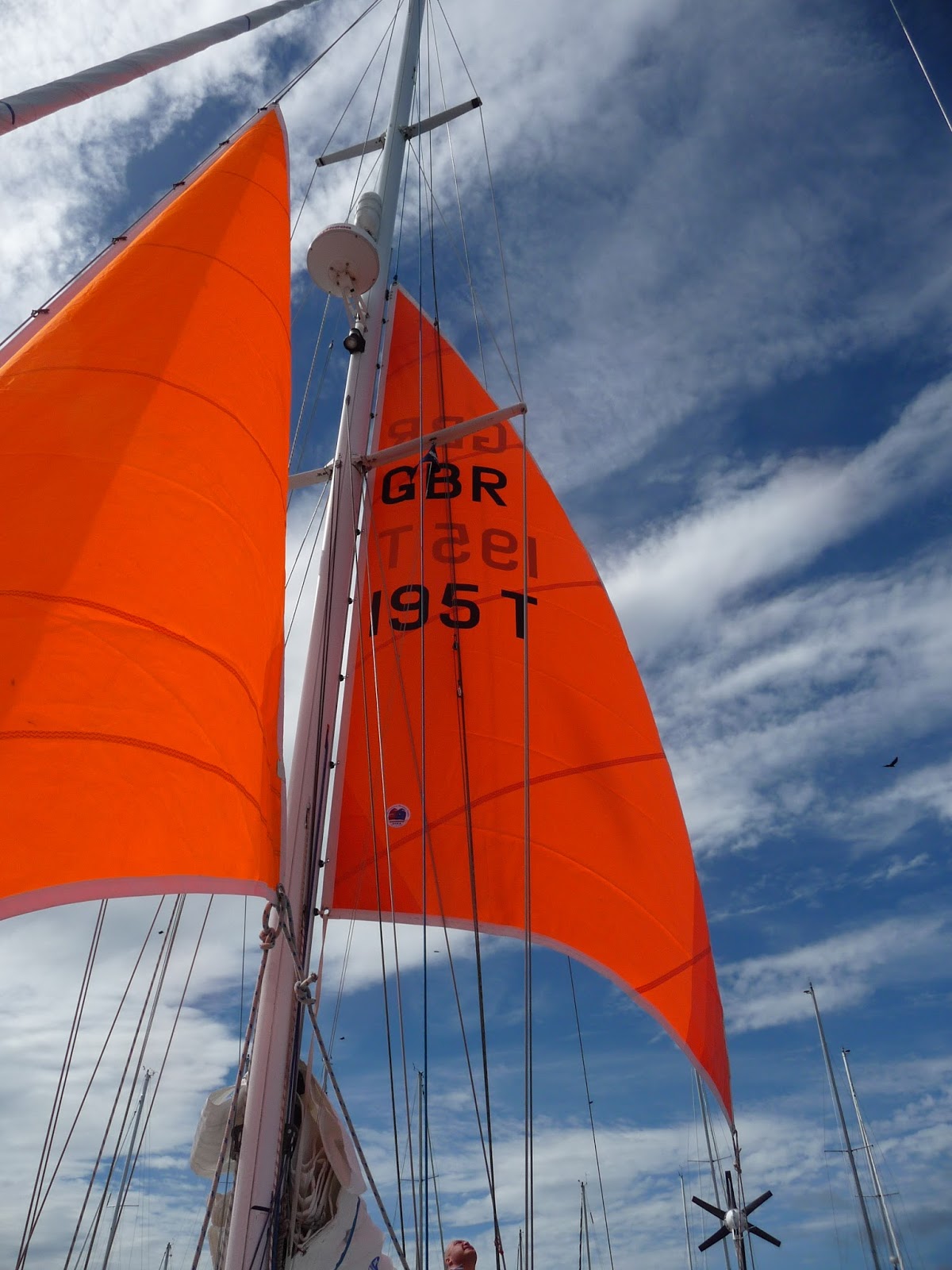 Susie thought she saw a whale spout in the distance soon after dawn and with the wind easing down from its overnight peak of F5 gusting 6 the sea became flatter. Mid-morning the mainsail was raised again, easy now the Skipper had spent the previous day sorting out the Lazy Jacks that had long languished at the mast (it was probably five years since we last had them in place). Lazy Jacks are long lengths of “string” that hang from high up on the mast and reach out like crows feet to points along either side of the boom to form a cradle into which the mainsail can quickly be dropped without the need for crew to be on deck folding it. Our latest mainsail is now used enough to squash down into a neat pile that can be swiftly tied in place. Kevin has got them sorted so we could drop the sail quickly if need be during the night as there would only be one of us on watch.