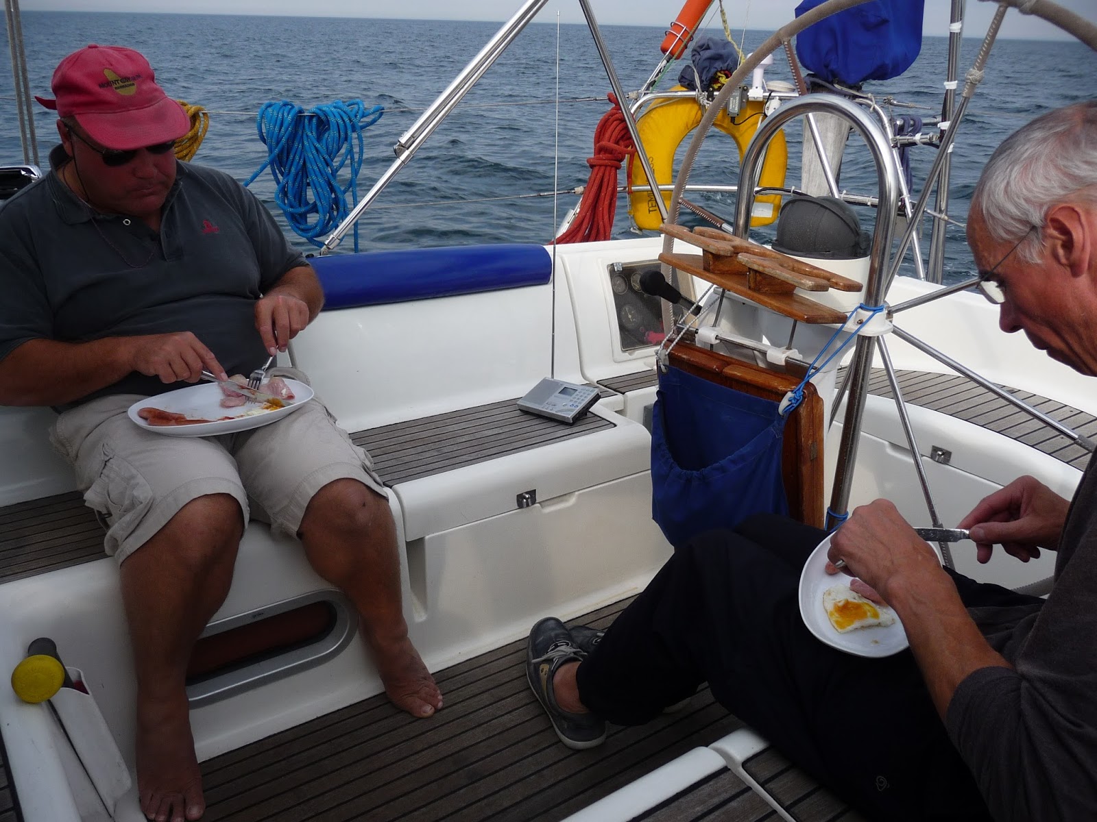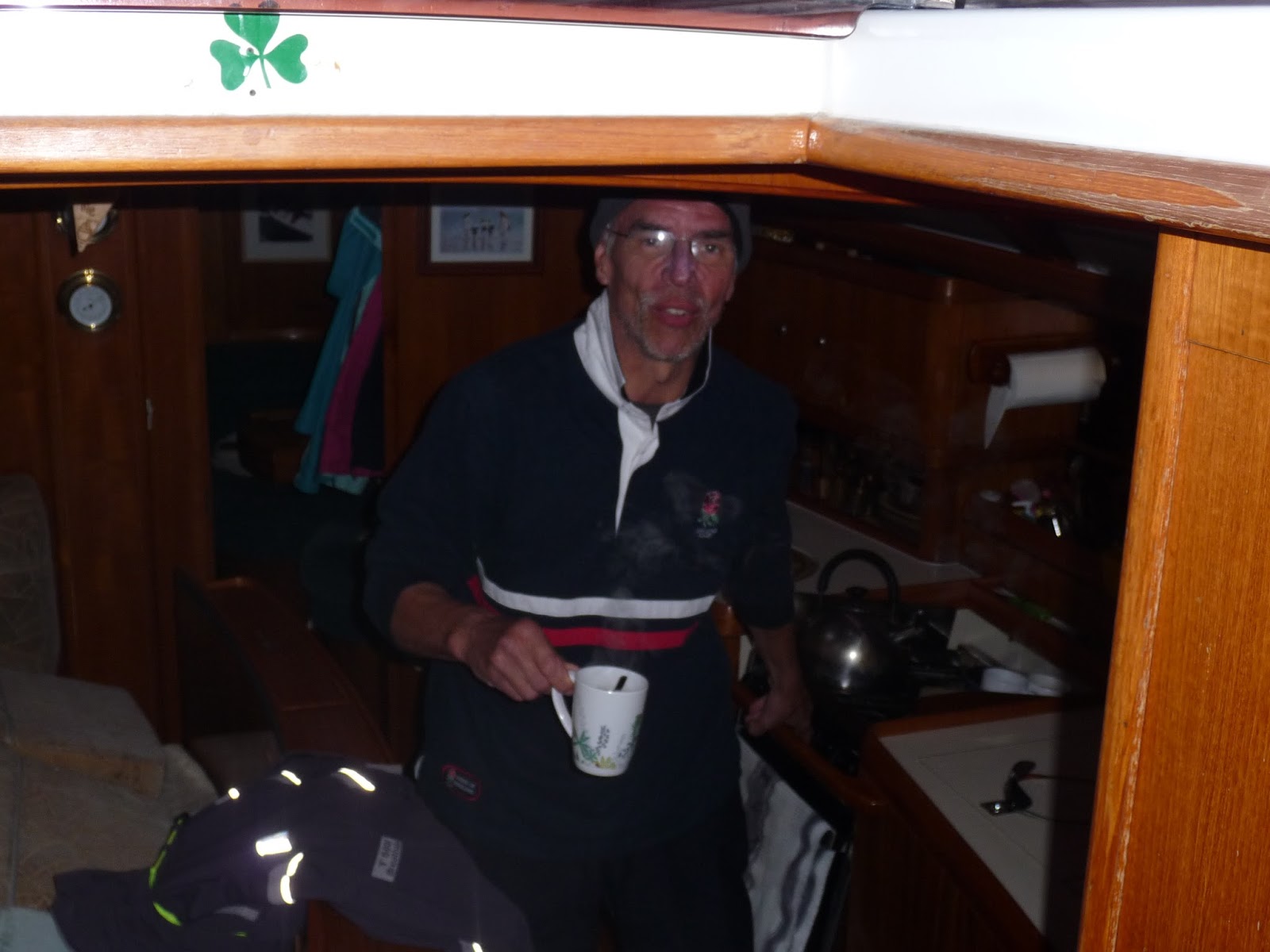 A note of explanation about the Bay Restaurant – you can locate it in one of two ways; either sail down190 degrees from Cork Harbour or alternatively follow the trail of veggie peelings from the same location. It is open for breakfast, lunch and supper serving good hearty crew meals. The three chefs are all well practised in the gentle art of juggling pots and pans on a swaying cooker as the boat bounces off the wave tops and can behave like an octopus when it comes to serving up into several bowls sliding across the worktop. Sunday nights special was fish pie made with a huge piece of smoked hake purchased from Dunns fish counter in Carrickaline, it was topped with mashed potatoes and cheese.