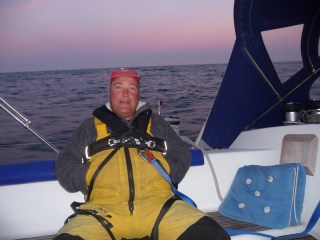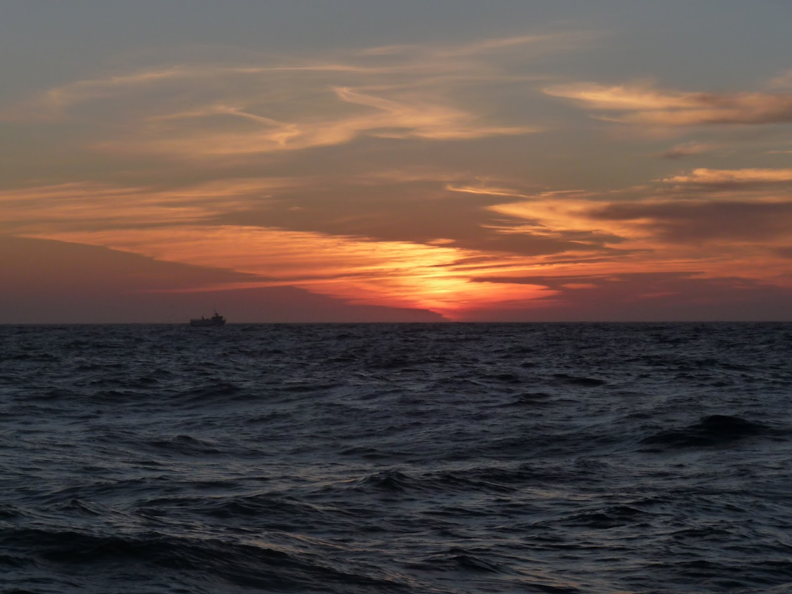 Once out beyond the bay though things perked up. The true wind was a lively north easterly as per the forecast. Temptress kicked up her heels with a full genoa (no mainsail) and headed south at seven knots. Dolphins came to play in our bow wave throughout almost the whole voyage, we’ve never seen so many sometimes several dozen were prancing around us leaping out of the water side by side in fours! The Portuguese Trade Winds and the related Portuguese current sped us south through the morning, we were making better than planned progress. Temptress was soon crossing the International border meaning a change in courtesy flags. HMS Penzance passed us heading for Porto around noon (without the AIS we’d have just put her down as a local warship). By early evening we’d had nibbles, a boat risotto was in progress (mince, peppers, courgette, tinned toms, herbs and rice) and the sun was still shining.