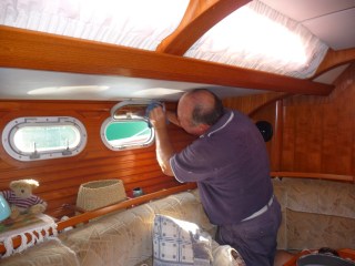 The same source has also provided us with an extension to the galley work surface. Many years ago I purchased a huge expense a teak chopping board designed to fit in the sink recess making the space a useful place to prepare food or rest a hot saucepan. However there are two sinks so I have long wanted a second board to double the work surface but wasn’t prepared to spend £75 on another lump of teak. In one of those light bulb moments I realised that the hardwood planks Kevin had purchased were rubberwood, ideal for a chopping board. Back we went to Rashid the wood merchant, his shop is small with two narrow aisles between vertical stacks of timber of all sort, below ground level underneath the office at the back are various cutting machines. He supplies the furniture makers in town and there is a wonderful scent of cedar and other woods. We presented him with our well worn teak board, could he help? Yes he could supply the timber and knew someone who would make one for us. No idea of the price but it wouldn’t be expensive and would be ready tomorrow, in fact when we collected it the price was 150 dirhams. Another Moroccan bargain!