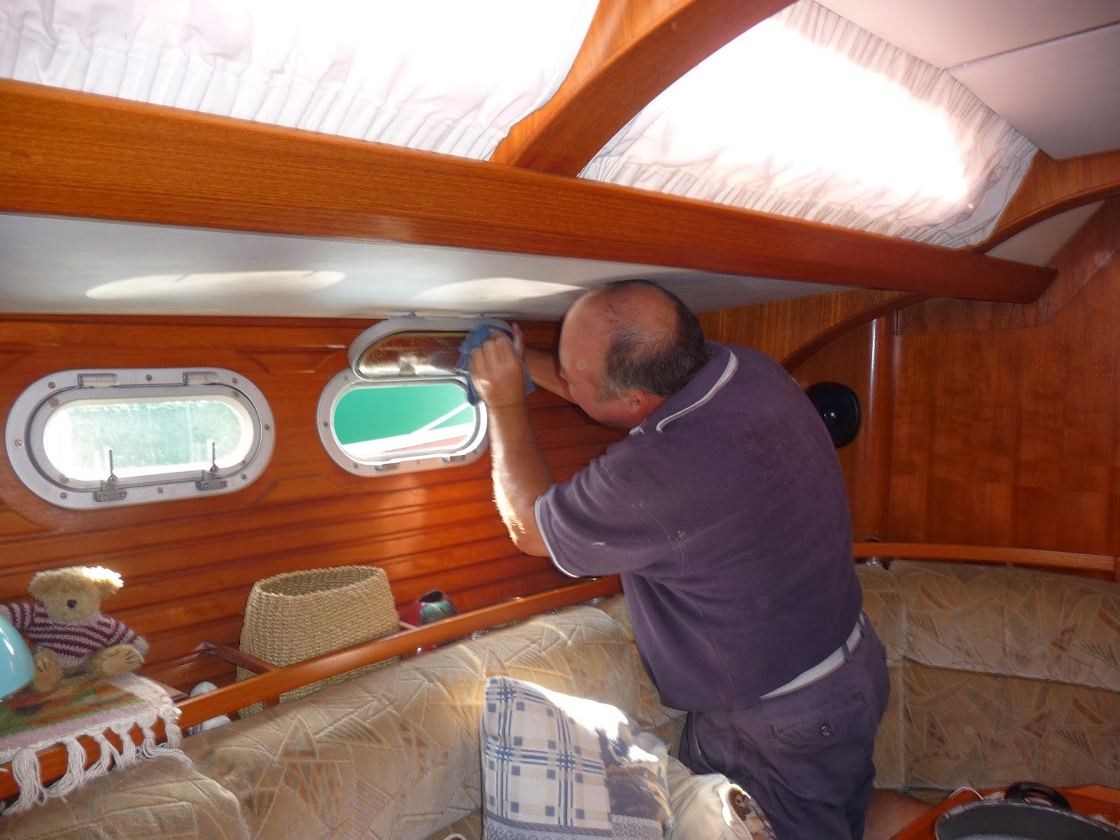 Laundry day for Temptress was yesterday. Today we made a determined effort to cross off some of the jobs on our boat list which is surprisingly short at present with only twenty or so entries. Kevin washed around all the hatches, the inside surrounds were a bit black with that mould that grows on dust gathering in the nooks and crannies. Keeping the porthole seals clean means they form a more watertight closure at sea (no leaks) so is a regular task. Meanwhile on the foredeck I stitched in place the replacement protective leather cover on the pulpit. I’d cut it out yesterday. Afterwards shut inside whilst Kevin hosed down the decks I sent a couple of emails either requesting info on future ports or sharing with fellow cruisers info we’d been given on anchoring in the Canaries.