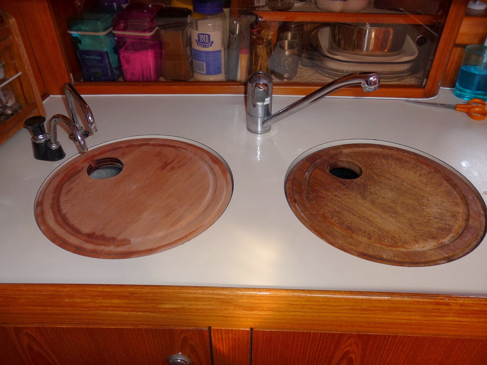 The same source has also provided us with an extension to the galley work surface. Many years ago I purchased a huge expense a teak chopping board designed to fit in the sink recess making the space a useful place to prepare food or rest a hot saucepan. However there are two sinks so I have long wanted a second board to double the work surface but wasn’t prepared to spend £75 on another lump of teak. In one of those light bulb moments I realised that the hardwood planks Kevin had purchased were rubberwood, ideal for a chopping board. Back we went to Rashid the wood merchant, his shop is small with two narrow aisles between vertical stacks of timber of all sort, below ground level underneath the office at the back are various cutting machines. He supplies the furniture makers in town and there is a wonderful scent of cedar and other woods. We presented him with our well worn teak board, could he help? Yes he could supply the timber and knew someone who would make one for us. No idea of the price but it wouldn’t be expensive and would be ready tomorrow, in fact when we collected it the price was 150 dirhams. Another Moroccan bargain!