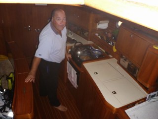 Friday morning we decided to try out our new Turkish fishing lure a gift from the crew of SY Istanbul some weeks ago. It was not a success; we caught no fish but that was mainly because despite various swivel/weight arrangements, the line twisted badly as the lure regularly bounced off the swell. Then the skipper managed not once but twice to lift up the rod in a manner that ensured he ensnared Fred our wind generator. There were several fraught moments but having binned three long lengths of twisted oily line during the course of the day we could only laugh at our cackhandedness then discuss ideas for repositioning the rod holder so our very bendy Tuna rod is less likely to act as a catapult for the lure. Alternatively we could get out Kevin’s big deep sea trolling reel that we have never used in ten year of ownership and workout how to mount it on the pulpit rails thus removing the rod from the equation altogether…. Just need a fishing tackle shop.