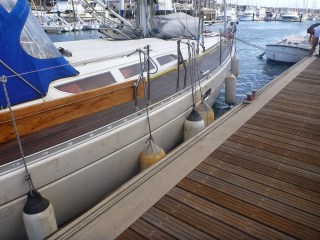 Although Kevin was fairly confident we could turn (ahead on one engine, astern on the other) and poke our bow in, rid ourselves of the tow and then be heaved in the rest of the way by the now large reception committee, the HM himself wavered. Temptress turned but wasn’t going fast enough so drifted almost across the entry to the boatyard hoist basin. Kevin yelled, I looked up and caught mostly in the face a line from the far corner of the basin which was quickly secured to our starboard stern cleat. A line off our bow was taken by the team on the pontoon finger whilst others ensured we didn’t collide with our other new neighbour “Orion I” moored on the opposite side of short finger. Soon the hullabaloo was over, the crowd departed and we were left to make Temptress secure. Debbie offered us coffee and her husband John made us welcome assuring us that we were in good hands even if the HM’s boat handling did leave something to be desired.