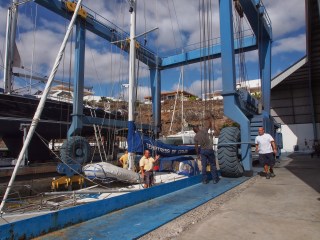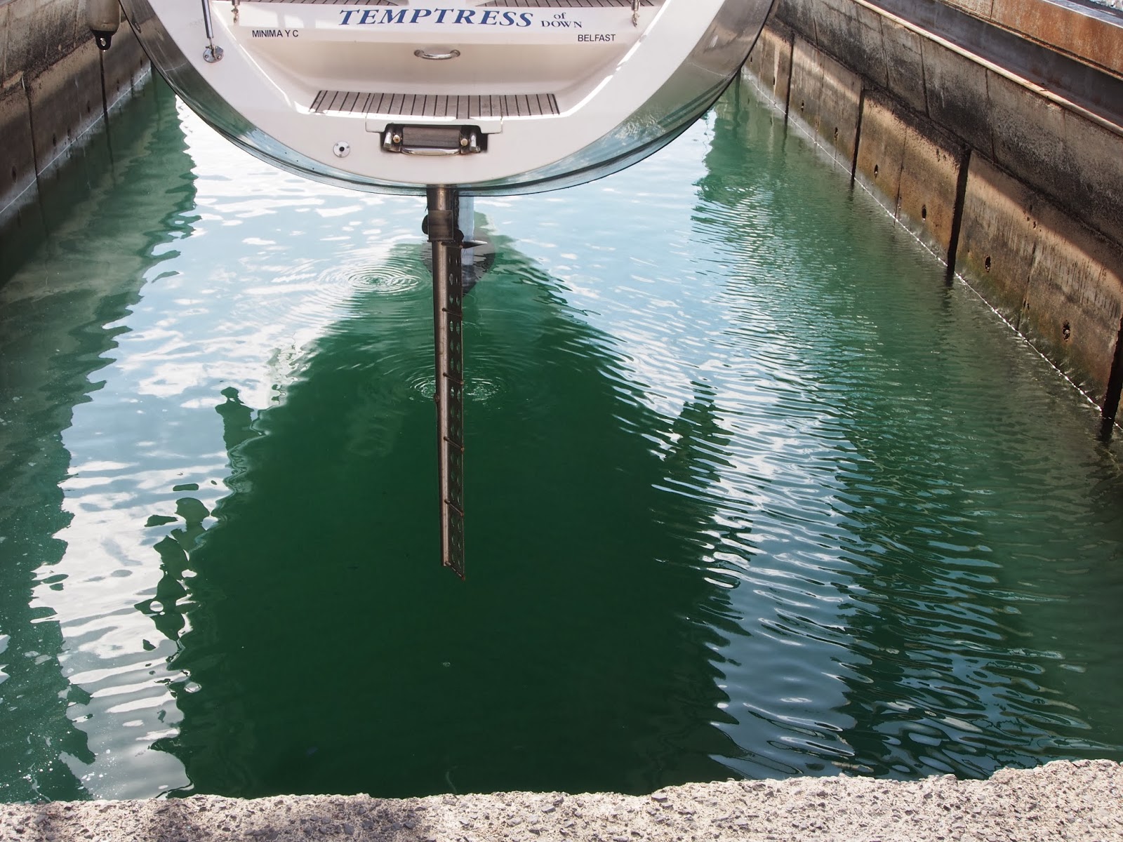 The skeg and internal structures were pronounced okay which was a relief, though the stern tube needs some cosmetic repairs. Mid afternoon Temptress was dropped back in the water without a hitch. Afterwards she was manhandled around so we are now stern to the pontoon meaning the cockpit is protected from the northerly breezes and has sunshine rather than shade most of the day. Result! Next step is to collate all the quotes for work to be done; rudder building, gelcoat repairs, sail and sprayhood repairs etc. and submit to the insurance company.