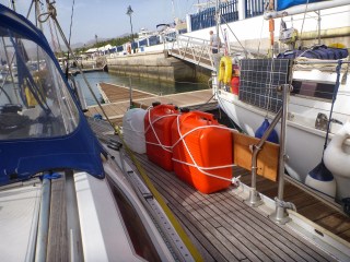 Having turned down by reasons of cost and space, fuel cans in a sale in Baiona, Kevin has spent many hours since trawling hardware stores for suitable containers and planks. In Rabat he purchased two lengths of Havea (Rubberwood) for a good price and oiled them. Initially these were tied to the stanchions either side of the boat just forward of the cockpit using string but here in Lanzarote he was finally able to buy U-bolts so redrilled the holes and attached the planks outside the stanchions to give more space for cans and passing crew. The cans were found in Arrecife, a little expensive but practical sizes and strong plastic which we hope will be UV resistant for a few years. Four thirty litre fuel cans and two twenty litre water containers are now secured in place using lengths of white cord, one cord per can so only one has to be undone at any one time. The water containers will give us an emergency supply should we ever contaminate Temptress’ water main tanks and provide a means for capturing rainwater if the watermaker fails. Just need a funnel now to direct the rain into them from the forward end of the mainsail.