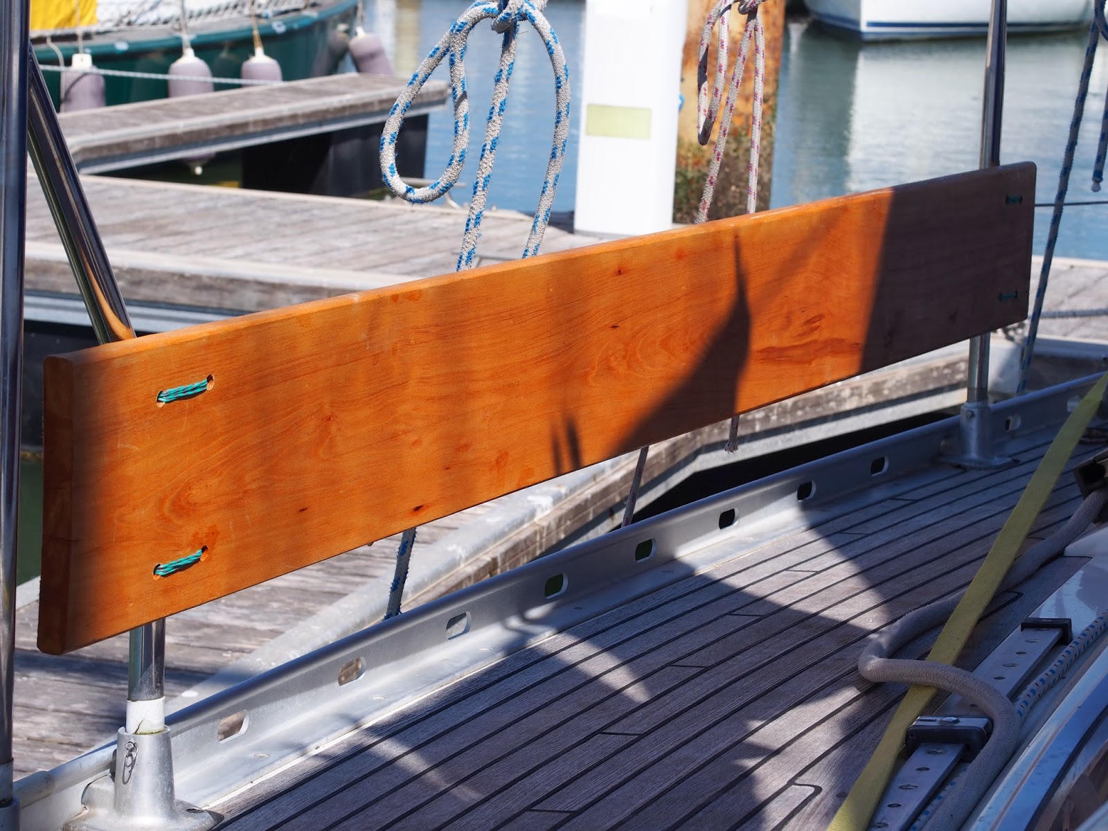 With our fuel tank holding sufficient fuel for 500nm of motoring it is rare that we are ever short but for an ocean crossing with the potential for a lack of wind any extra fuel we can carry is a bonus. It will give us peace of mind being able to run the engine to charge the batteries if solar and wind generation fail or are insufficient as well as get us into a port. With that in mind Kevin had been mulling over how to fix fuel cans on the side deck since we left the South Coast last May. In Ireland we met a boat “Lady Menai” who had a plank affixed between the stanchions on either side of the boat. Each plank was drilled with holes through which line could be threaded back and forth around the cans ensuring they were securely attached and would survive almost any bad weather.