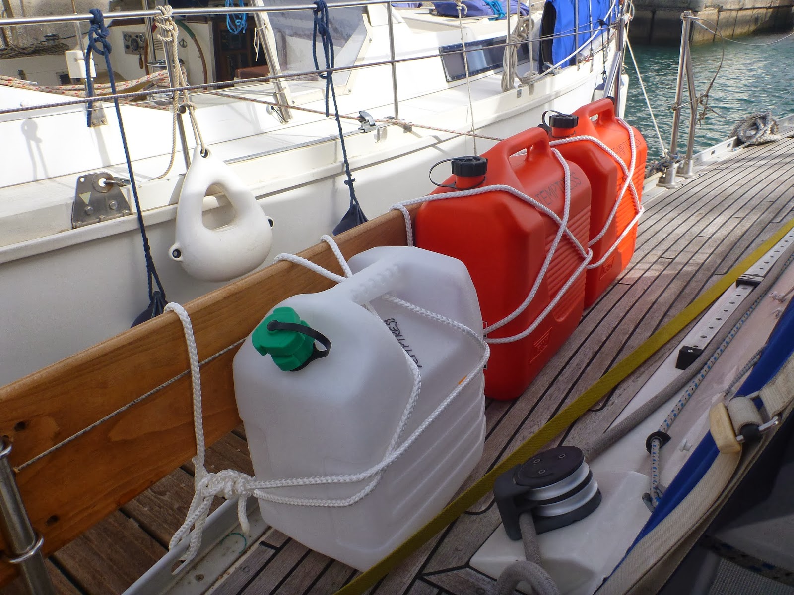 Having turned down by reasons of cost and space, fuel cans in a sale in Baiona, Kevin has spent many hours since trawling hardware stores for suitable containers and planks. In Rabat he purchased two lengths of Havea (Rubberwood) for a good price and oiled them. Initially these were tied to the stanchions either side of the boat just forward of the cockpit using string but here in Lanzarote he was finally able to buy U-bolts so redrilled the holes and attached the planks outside the stanchions to give more space for cans and passing crew. The cans were found in Arrecife, a little expensive but practical sizes and strong plastic which we hope will be UV resistant for a few years. Four thirty litre fuel cans and two twenty litre water containers are now secured in place using lengths of white cord, one cord per can so only one has to be undone at any one time. The water containers will give us an emergency supply should we ever contaminate Temptress’ water main tanks and provide a means for capturing rainwater if the watermaker fails. Just need a funnel now to direct the rain into them from the forward end of the mainsail.