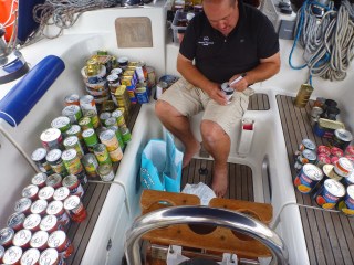 The bilges are almost full – a couple of dozen tins of tomatoes, what seems like six months worth of baked beans, corned beef and car crash (tinned sardines in tomato sauce, a sandwich favourite) plus lots of other stuff. The aft heads space under the sink is crammed with packs of loo roll in protective bin liners (trying to estimate the quantities required reduced us to some schoolboy humour). A cubbyhole under the chart table is likewise stuffed with eight kitchen rolls and three boxes of Kleenex, I was amazed just how much could be fitted in this spot which has housed only a roll of flags for many years.