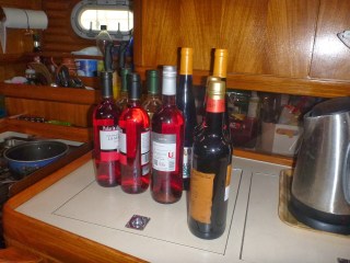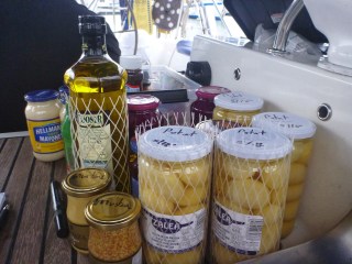 Under the saloon table are currently two folding crates full of tins of veg, jars of potatoes, tetra packs of sugar and jars of Nescafe Alta Rica. Saloon lockers are beginning to fill with dry stores like pasta and rice but we know there will be more to come; flour, yeast, kidney beans (if we can find them), drinking chocolate, the provisions list is endless and the quantities measured in kilos or dozens.