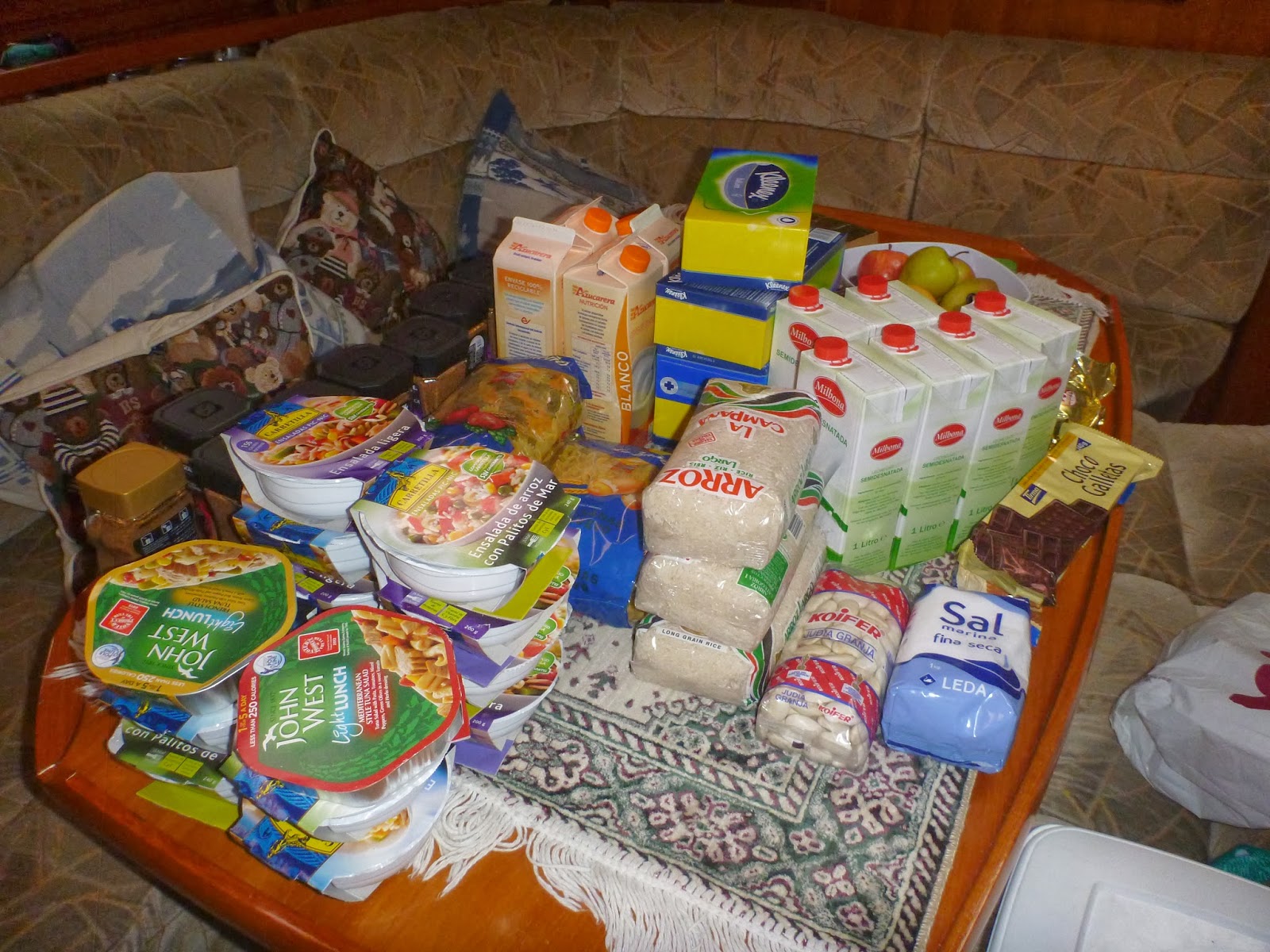 Food for six weeks plus is therefore required. Fresh foods like meat and veg are simply not going to last that long so Temptress has to be loaded with tins and dry stores like flour, pulses and beans. Potentially four weeks of eating meals made from canned food means variety will be key to keeping the crew happy so we are also adding tins never normally consumed like peaches – for breakfast as well as for desert and frankfurters (can you make a decent sausage casserole with these?). Utilising our hire car we’ve bought a massive amount of stuff already and have got to know what Lidl, Hiperdino and Eurospar offer. The focus has been on long term, heavy stuff like tins plus items we may not easily find “over there” like favourite coffee, shampoo and the like. More perishable items can wait until the crew arrive in January. We’ve also purchased foodstuffs that are relatively cheap here like powdered milk and washing up liquid. And edible items unique to Spain such as a vacuum packed cooked chicken (best before Feb 2014), hard cheeses (keep forever) and chorizios (also keeps for a long long time). But where to put it all?