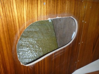 Other boats appear to have far more storage than Temptress with lockers behind and above the saloon seating backs as well as below the seating. It’s the price we pay for an airy open saloon. So we started looking at our boat with new space greedy eyes. Are there any “dead spaces” behind all that teak that are currently inaccessible? Well yes definitely behind the curves of the porthand sofa. With the upholstery all away being renewed we took up the challenge. Kevin drilled a thumb sized pilot hole and we eagerly peered in with the help of a torch. Both ends revealed sizeable voids. I went out for an hour or so and when I returned neat ovals had been cut. A couple of judiciously placed pieces of marine ply prevent any contents sliding beyond arms reach along the back of the sofa. Temptress has two new lockers. A length of table protector will pad the hull to prevent rattles and condensation then we can put the lockers to use. We are now wondering where else!