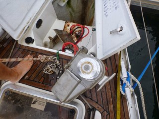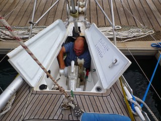 A day or so later Kevin threaded himself feet first into the well, the only way to undo the bolts that hold the anchor windless and its steel plate in place. Both I and passers by wondered if he’d get out again but he did. Then the forepeak had to be partially emptied of sails so that the windless could be disconnected from its power supply as the cables aren’t long enough to otherwise lift it onto the deck from its shelf at the rear of the anchor well. Meanwhile the rough weather lashing the coast resulted in the water supply to the pontoon being cut due to wave damage so fresh water to wash everything down with was in short supply. Having scrubbed away the dirt with bucketfuls of sea water the final rinse was water from the galley tap. The weather was decidedly flaky – apart from strong southerly winds which have been tossing water over the marina wall for the last couple of days, intermittent rain showers coated red Sahara dust on everything. And, when it wasn’t raining, you were breathing in that same thick dust leading to coughing and sneezing fits or a perpetual runny nose, working outside had become particularly unpleasant.