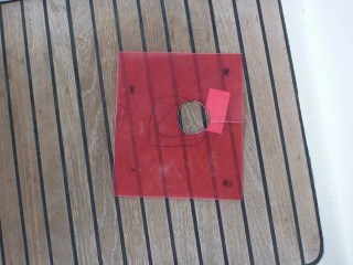 What to use as insulation? LanoCote, a sort of lanolin grease often used to protect against corrosion, had been smeared on when the steel plate was replaced a few years ago but obviously hadn’t stood up to the wear and tear of the anchor chain rattling past or all the salt water that washes into the anchor locker when at sea. As mentioned plastic is an ideal inert insulator. We recently bought a couple of 50x70cm sheets of 1mm thick translucent pink plastic in the local ferreteria as part of our ongoing mosquito screen project (more on that when it is complete). Ferreteria Tias (or FT) is a veritable Aladdins Cave of DIY materials and kitchen equipment that we have both become addicted to. Kevin re-purposed a 20x20cm piece of the lurid plastic to become a sandwich filling between the winch and its steel mounting plate. It is easily cut with scissors or a knife and can be drawn on with a biro or pencil.