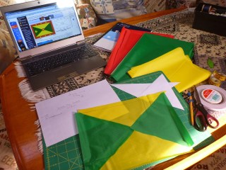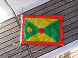After the Cape Verdes with our change of cruising plan Grenada looks like the next flag we’ll need and it is probably the most complex flag after the UK ensign that any flag maker will encounter. After taking whole day to create a template for the triangles, cut the parts out and stitch it I realised quite why courtesy flags are so expensive. The rectangular “ground” is made of two green and two yellow triangles all bordered in red. Then there is a red circle with a yellow star at the centre and a nutmeg in the green triangle at the hoist end plus a series of stars along the border top and bottom. All these components have a significance however only the circle and the nutmeg are prominent but I omitted the stars as they’ll hardly be seen when it is up the mast.