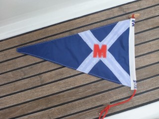 I decided a DIY approach would be more affordable and after all we’d have plenty of time on long passages and making flags might be fun. It seemed ripstop nylon was the cheapest non-fraying material available in lots of colours, the sort that is suitable for an average weight spinnaker or a tent. And it has the advantage of being light and packing down small. So after a bit of internet shopping Temptress’ flag kit was born with half a metre each of navy and sky blue, green, gold (orange) and yellow ripstop plus larger quantities of royal blue, red and white as one day I may even make a house flag for the boat with our mermaid logo and we needed a new Minima YC Burgee (this latter was finally created in Lanzarote). In addition to the ripstop I added a few metres of white inch and a half binding tape to make the hoist-end (the bit the string goes through) and sorted out a few duffle coat toggles from my button tin though mostly a bowline in the top of the string is sufficient.