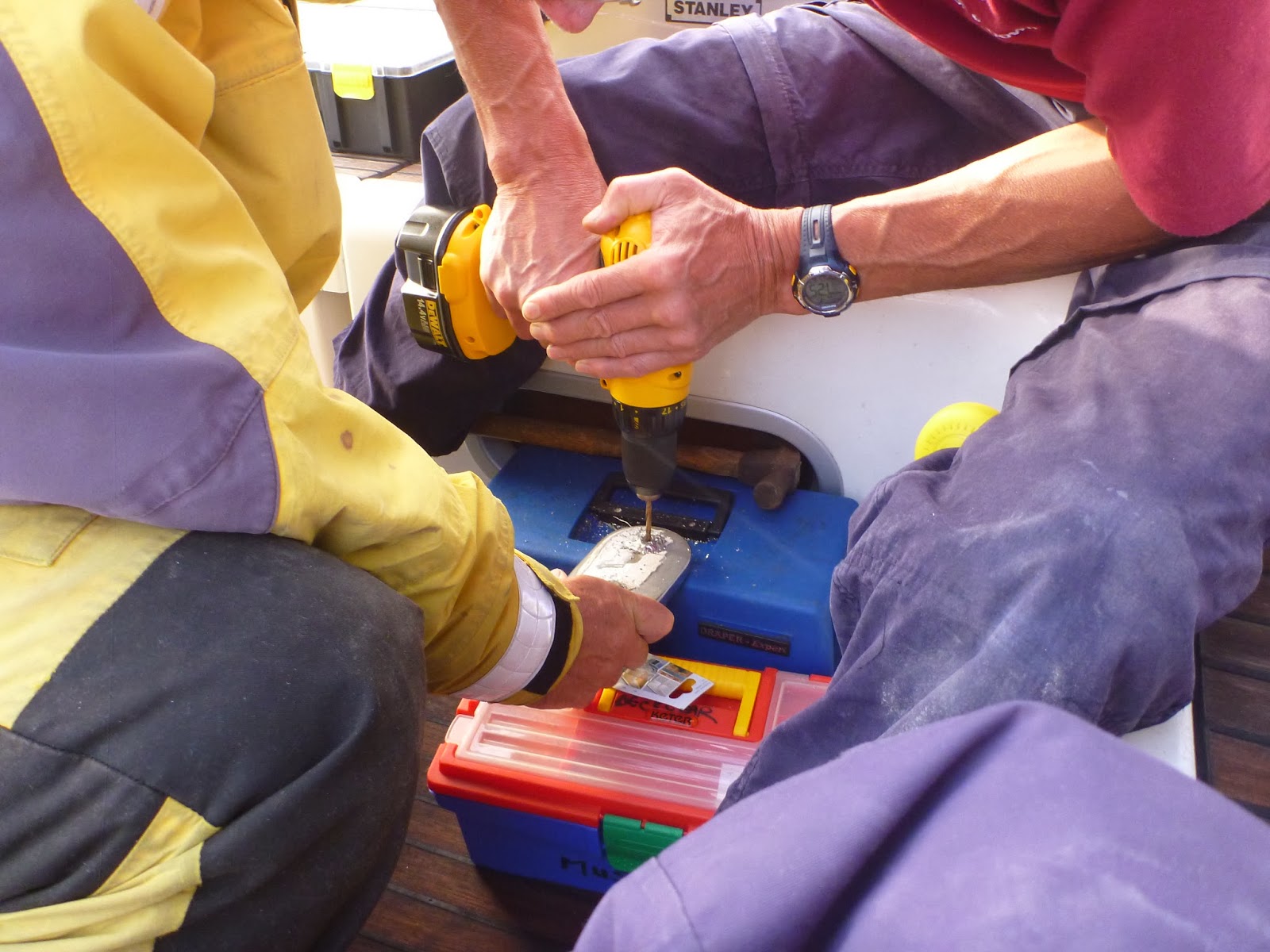 By first light Kevin had thought through a potential solution which would involve drilling out the original bolts from the deck fitting, knocking through the remaining stumps in the deck then using the largest bolts we had on board bolt, bolt through fitting, deck and the under deck base plate. The heads of the original bolts had been welded into the fitting so it was going to be a tough job making the holes.