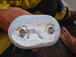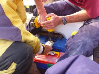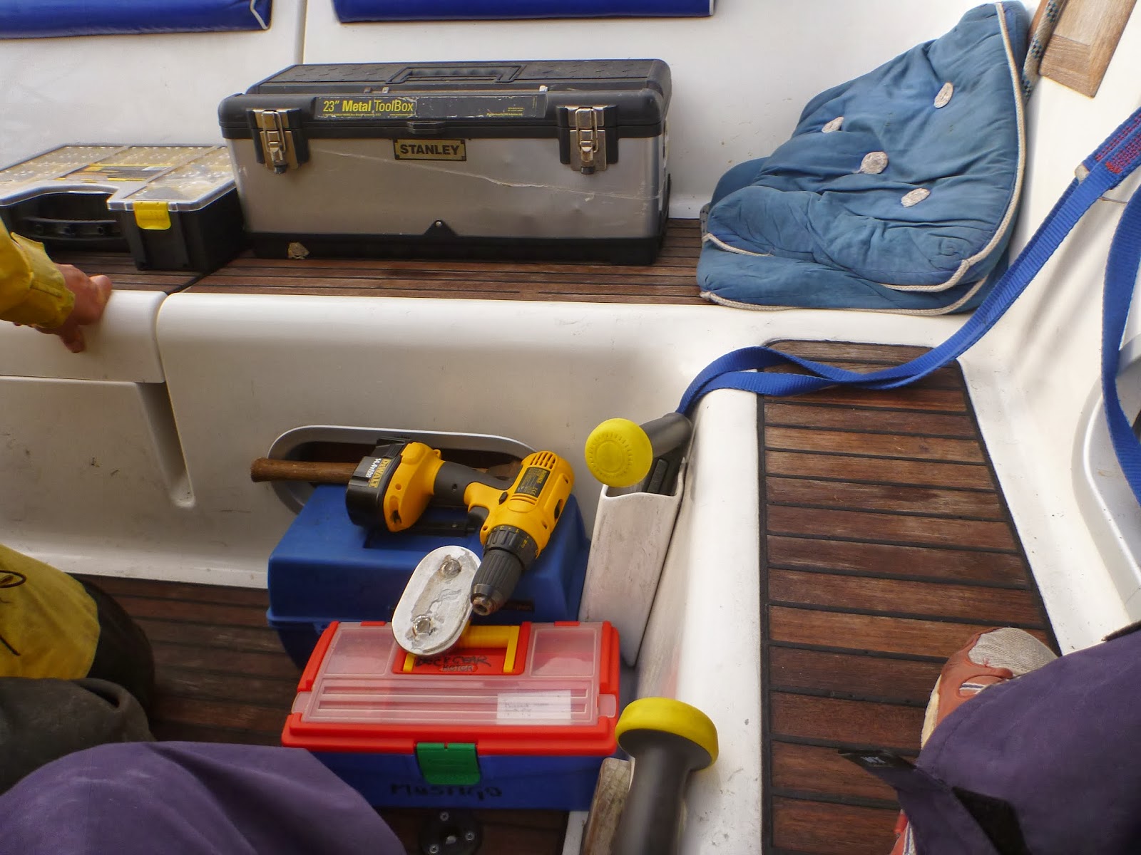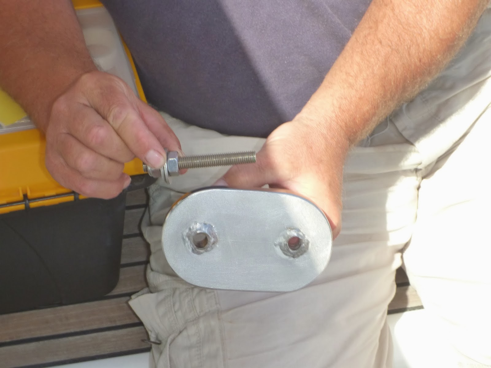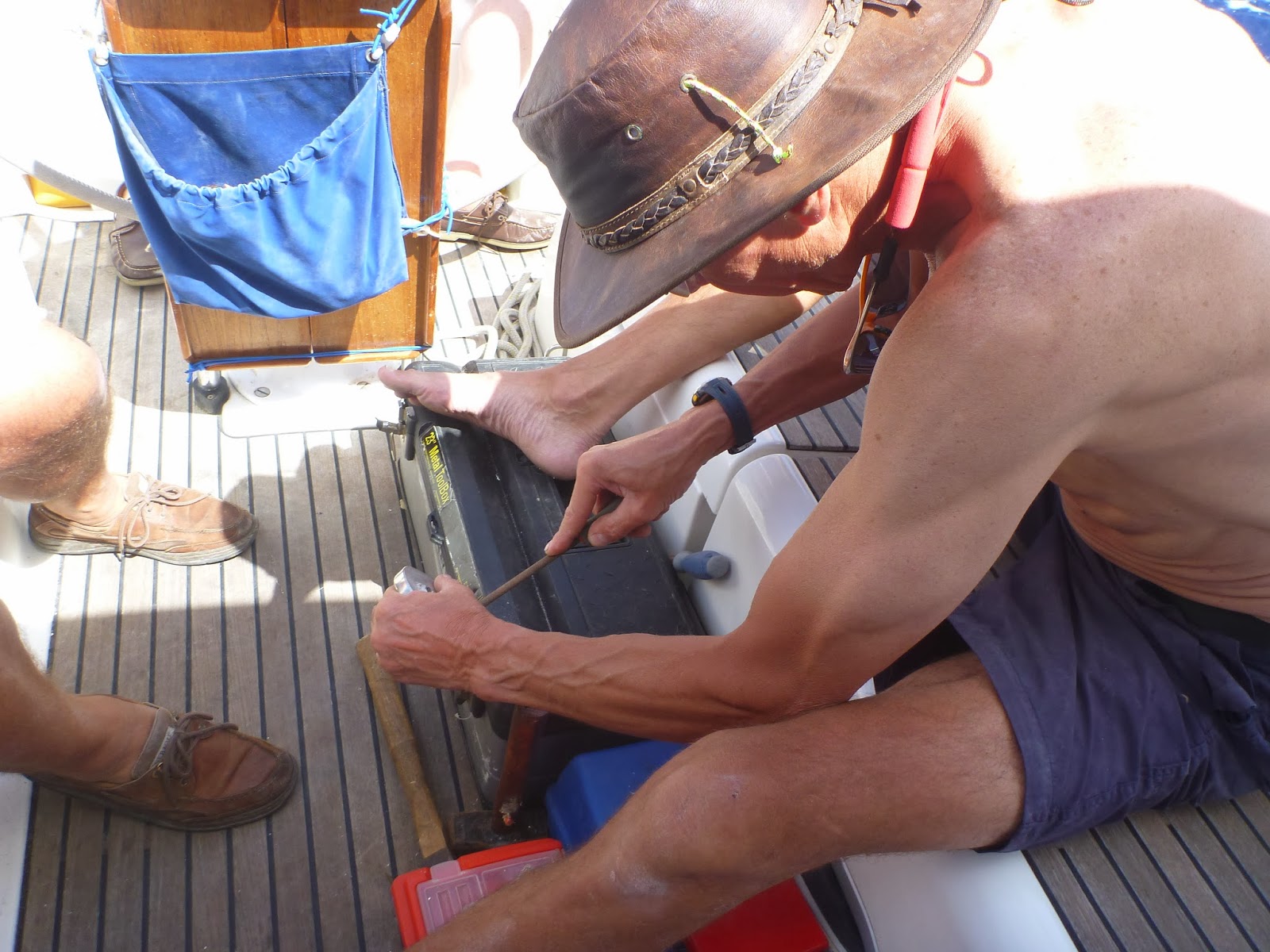 Without a vice or a proper workshop a storage box wedged in the corner of the cockpit became a workbench and a strong hand supported the thick piece of metal. Joe wielded the battery operated drill. Pieces of metal flew everywhere, shoes were required as was a regular brushing to avoid traipsing the sharp shards all over the boat. First pilot holes were made then gradually widened using progressively larger drills until they reached the ten mm diameter of the new bolts. The process was slow as despite having two batteries; in the warmth of a tropical day charging took a long time as the small inverter (one designed for in car charging of camera batteries and phones) kept overheating.