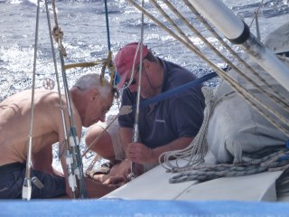 When the deck fitting sheared on the port hand forward lower shroud the skipper reacted with his usual cool level headedness when things get tough. For non-sailors this shroud is a thick wire cable between the forward edge of the mast at the lower spreader level and the deck. The deck fitting is a thick oval of stainless steel with a tang welded diagonally on the top to which the shroud is attached via a bottle screw.