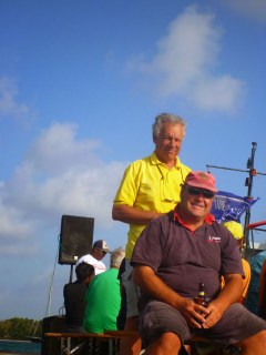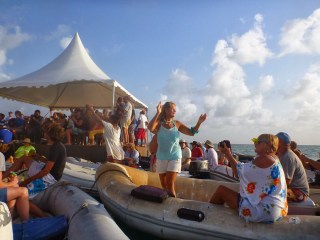 Take one large steel work barge, one length of concrete pontoon and a small tug; add a bar under a marquee roof on the barge and a band under a bimini on the aft deck of the tug plus some sizeable speakers, some bench seating and a large number of sailors and you have a unique concert in the bay. The three of us like everyone else arrived by boat at the floating concert venue moored in the middle of Clarke Court Bay, Woburn, Grenada on Wednesday afternoon. And like many people we came armed with vouchers for a free beer courtesy of Island World chandlery where we had been shopping for boat bits a few days previous.